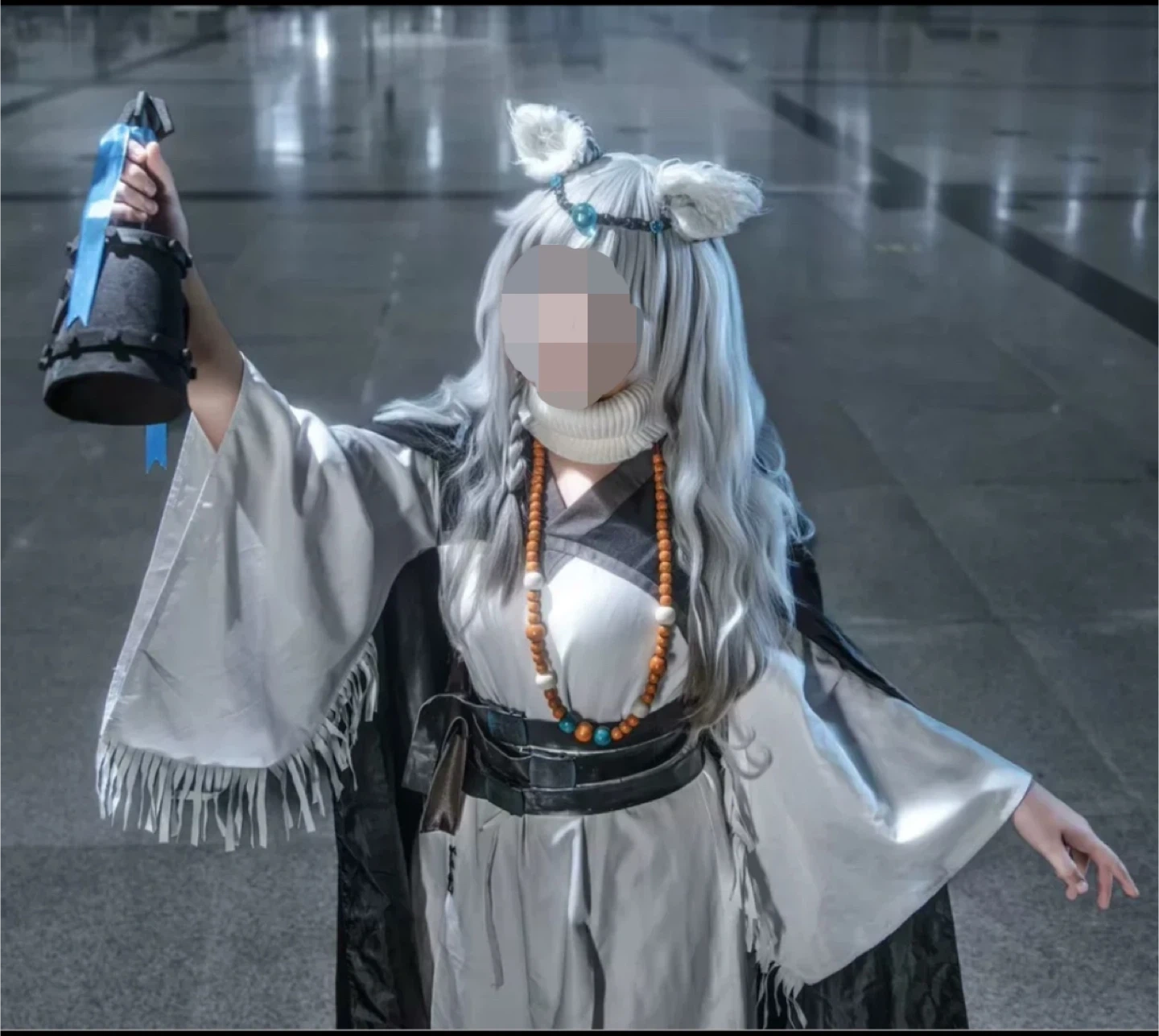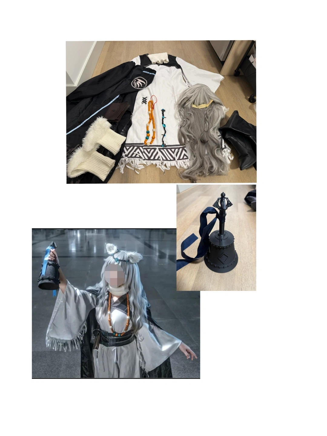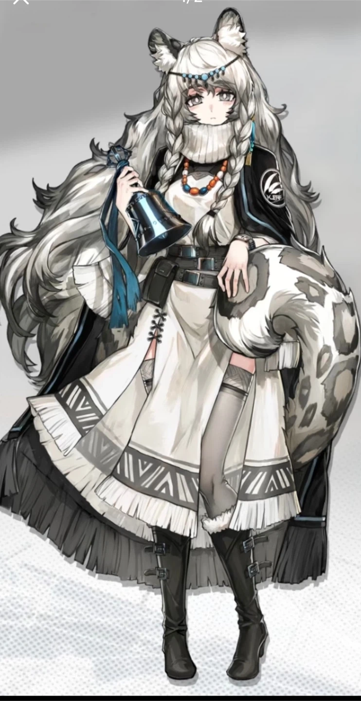 This is a full cosplay outfit based on the character Pramanix from Arknights. It includes a dress, a cloak, turtleneck ,wig, boots, necklace, hair accessories, ears and 3D printed bell, belts.