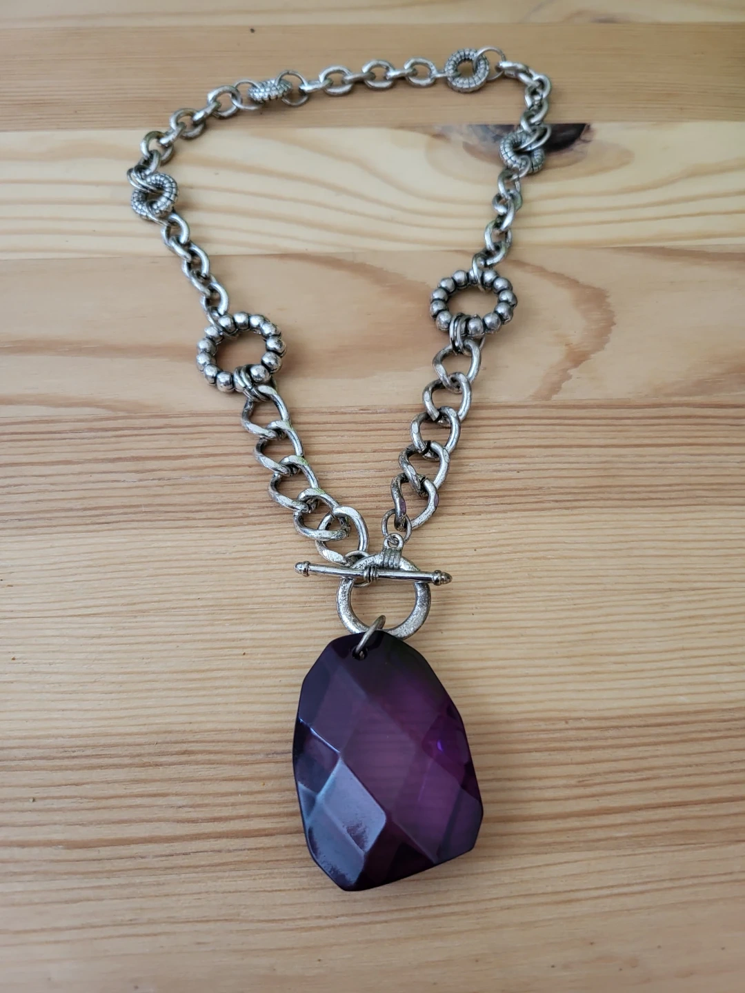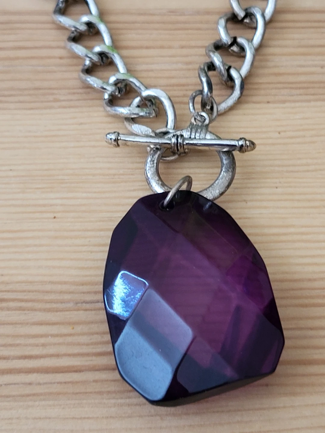 This necklace features a chunky silver-tone chain with decorative links. It's secured with a toggle clasp and has a large, faceted purple pendant. The vibrant gem adds a pop of colour to any outfit!