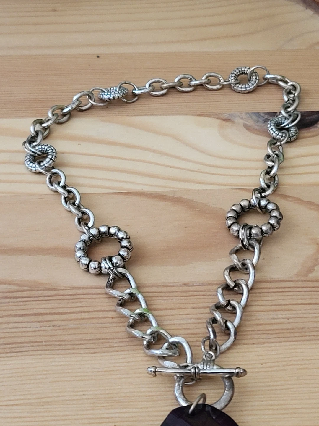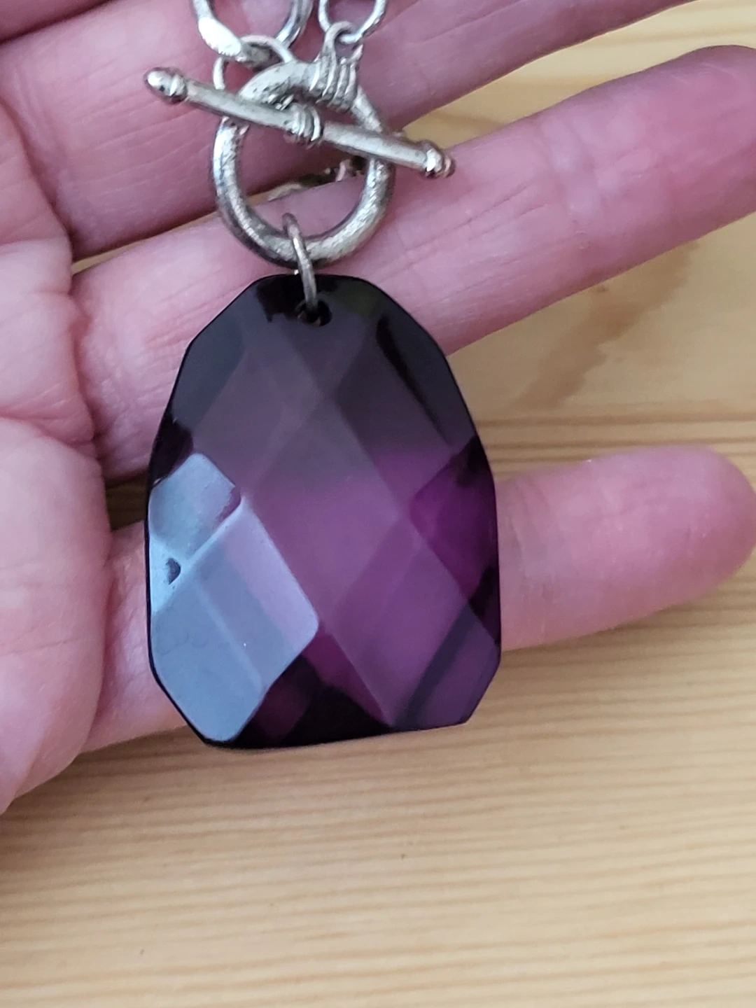 This necklace features a chunky silver-tone chain with decorative links. It's secured with a toggle clasp and has a large, faceted purple pendant. The vibrant gem adds a pop of colour to any outfit!