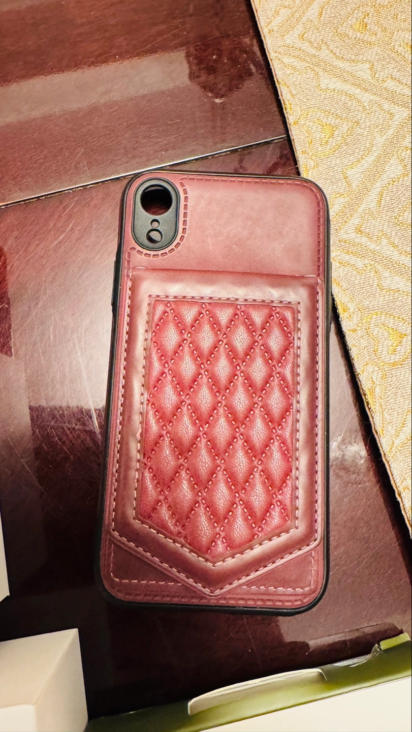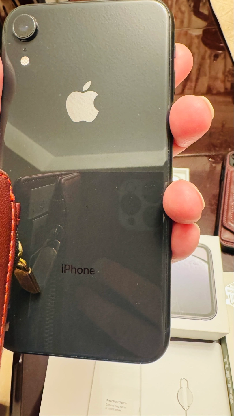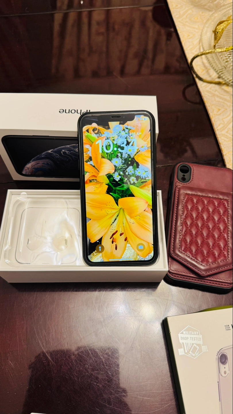 iPhone XR in black. Includes original Apple Earpods, a maroon leather wallet case, and a clear TUFF8 phone case. Military-grade drop tested. Box included.