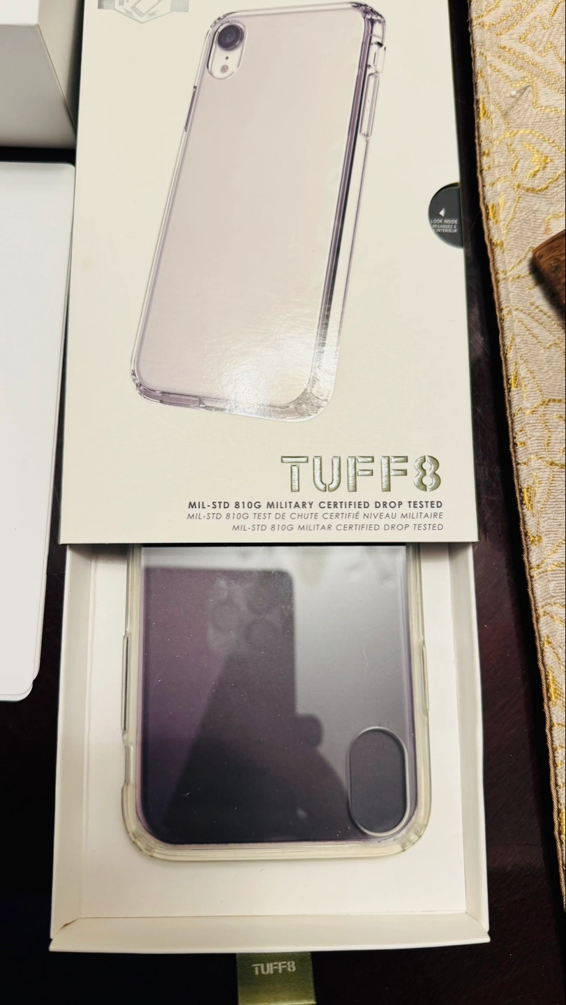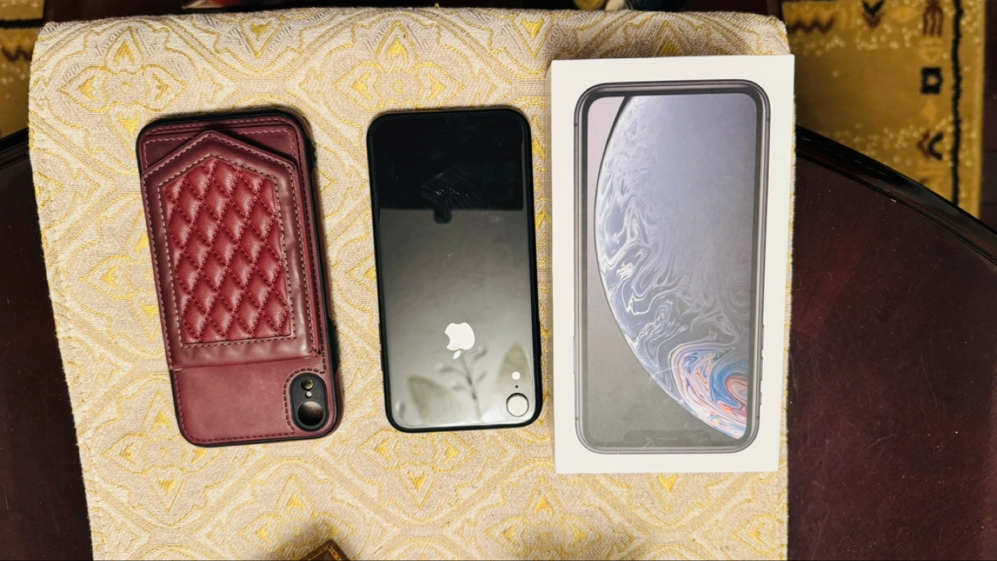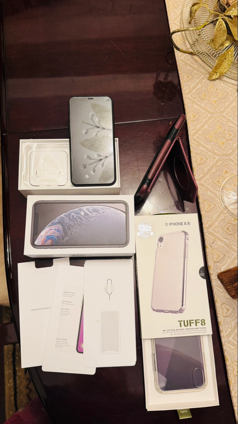 iPhone XR in black. Includes original Apple Earpods, a maroon leather wallet case, and a clear TUFF8 phone case. Military-grade drop tested. Box included.