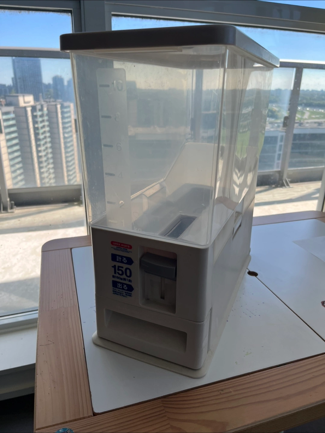Selling a rice dispenser in great condition! It's perfect for keeping your rice fresh and dispensing just the right amount. It measures rice in 150g increments. It's a handy addition to any kitchen