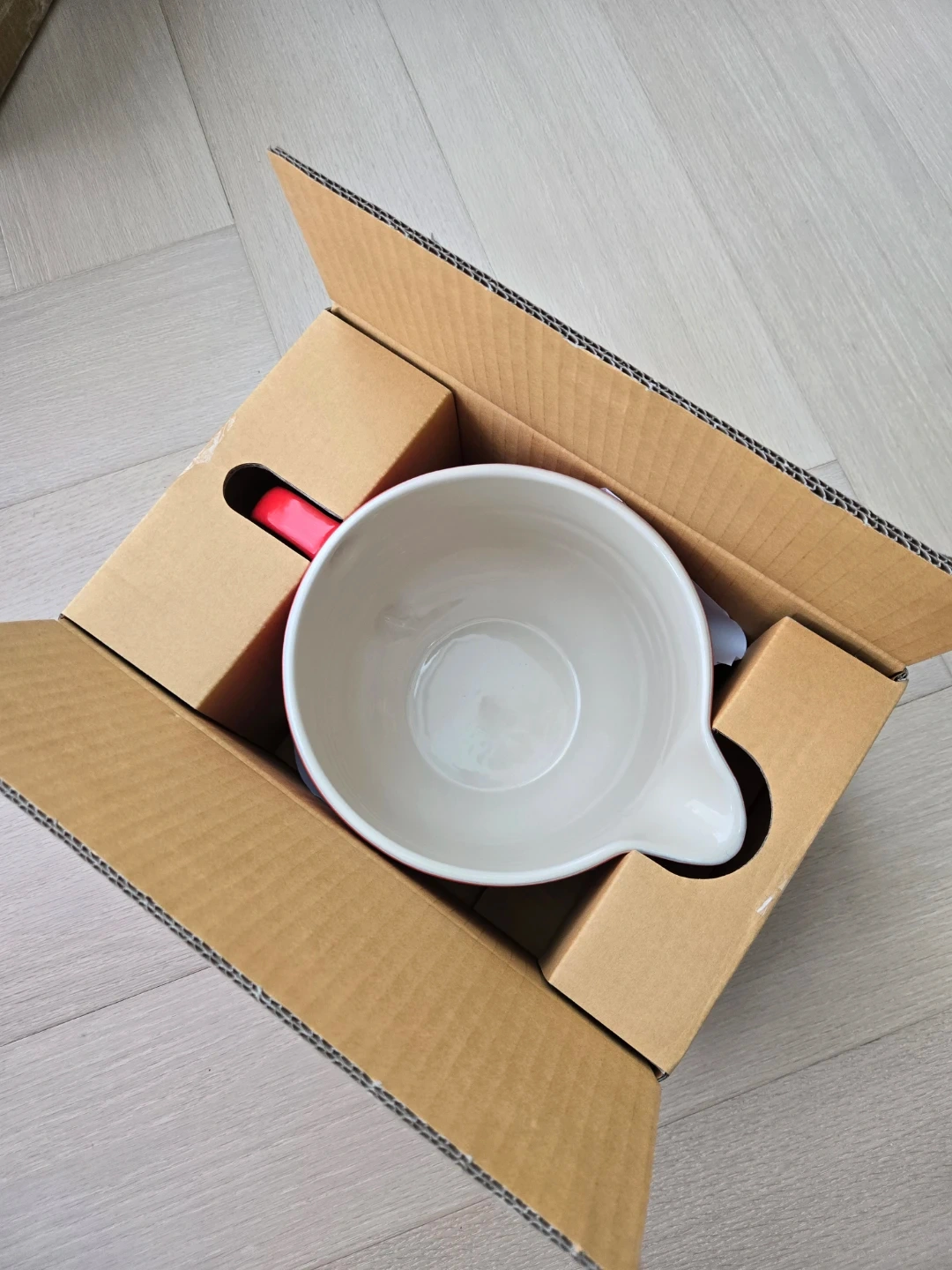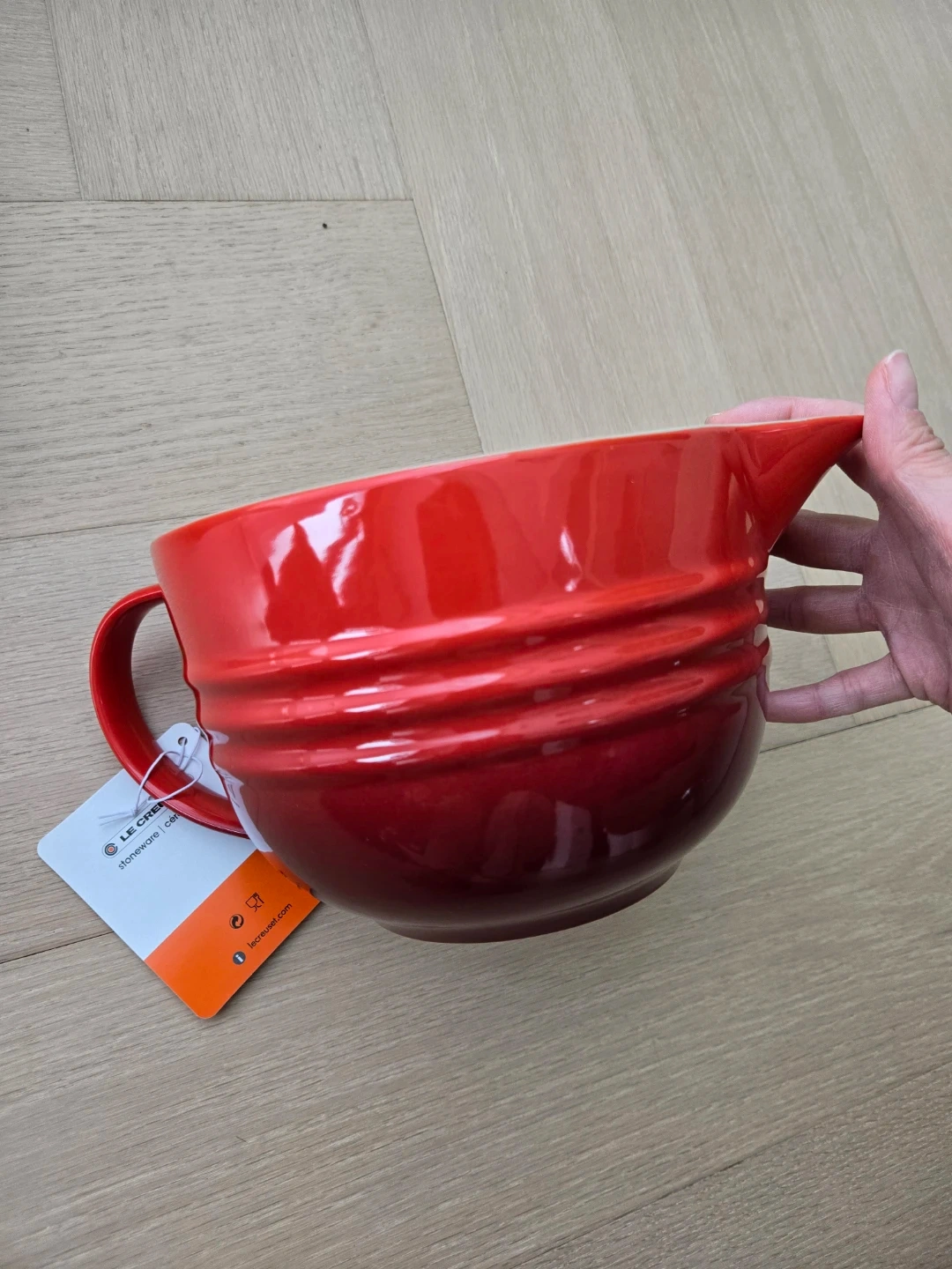 This Le Creuset mixing bowl is made of durable stoneware. It features a convenient handle and a pour spout for easy use. Includes original box.