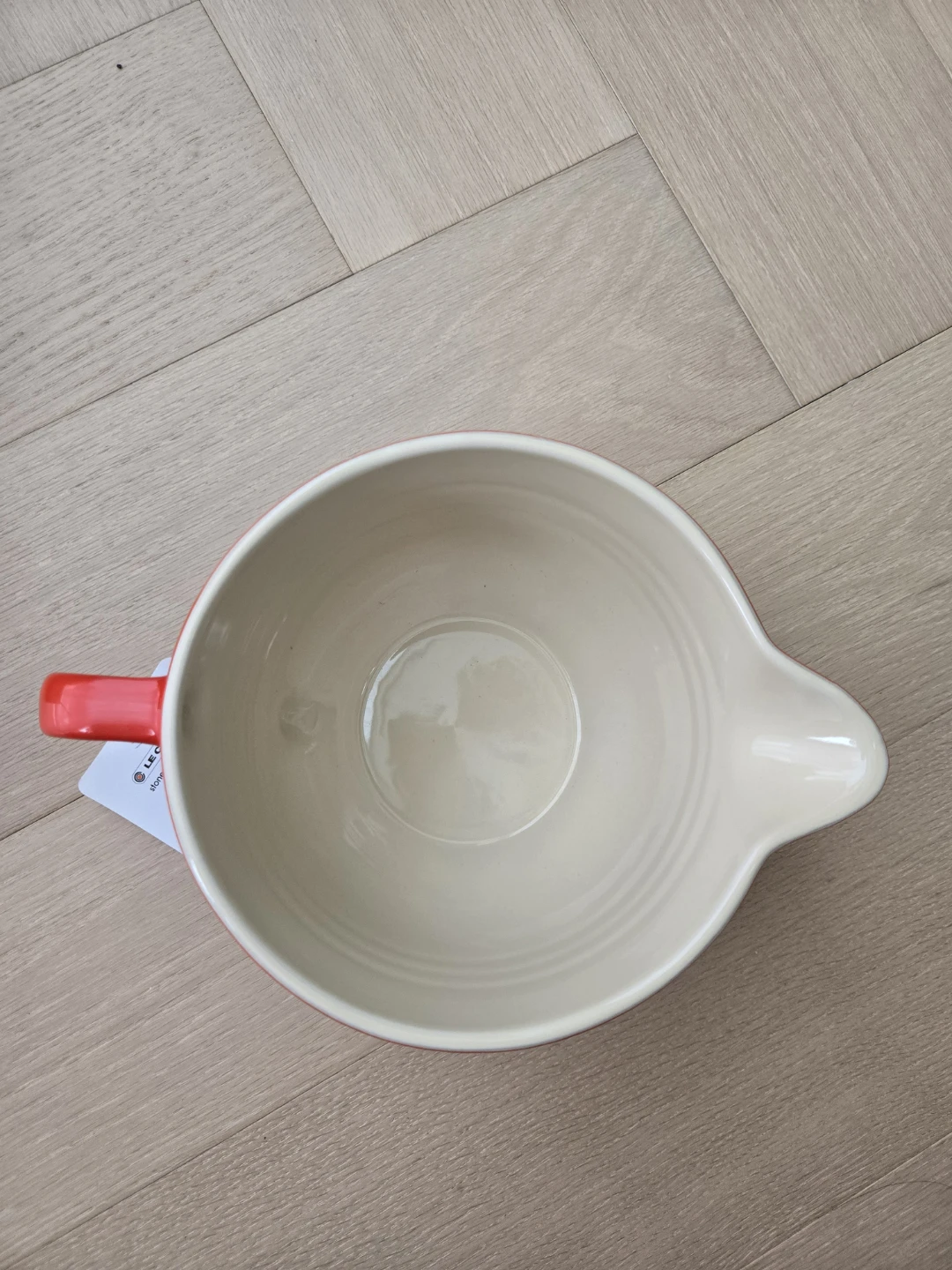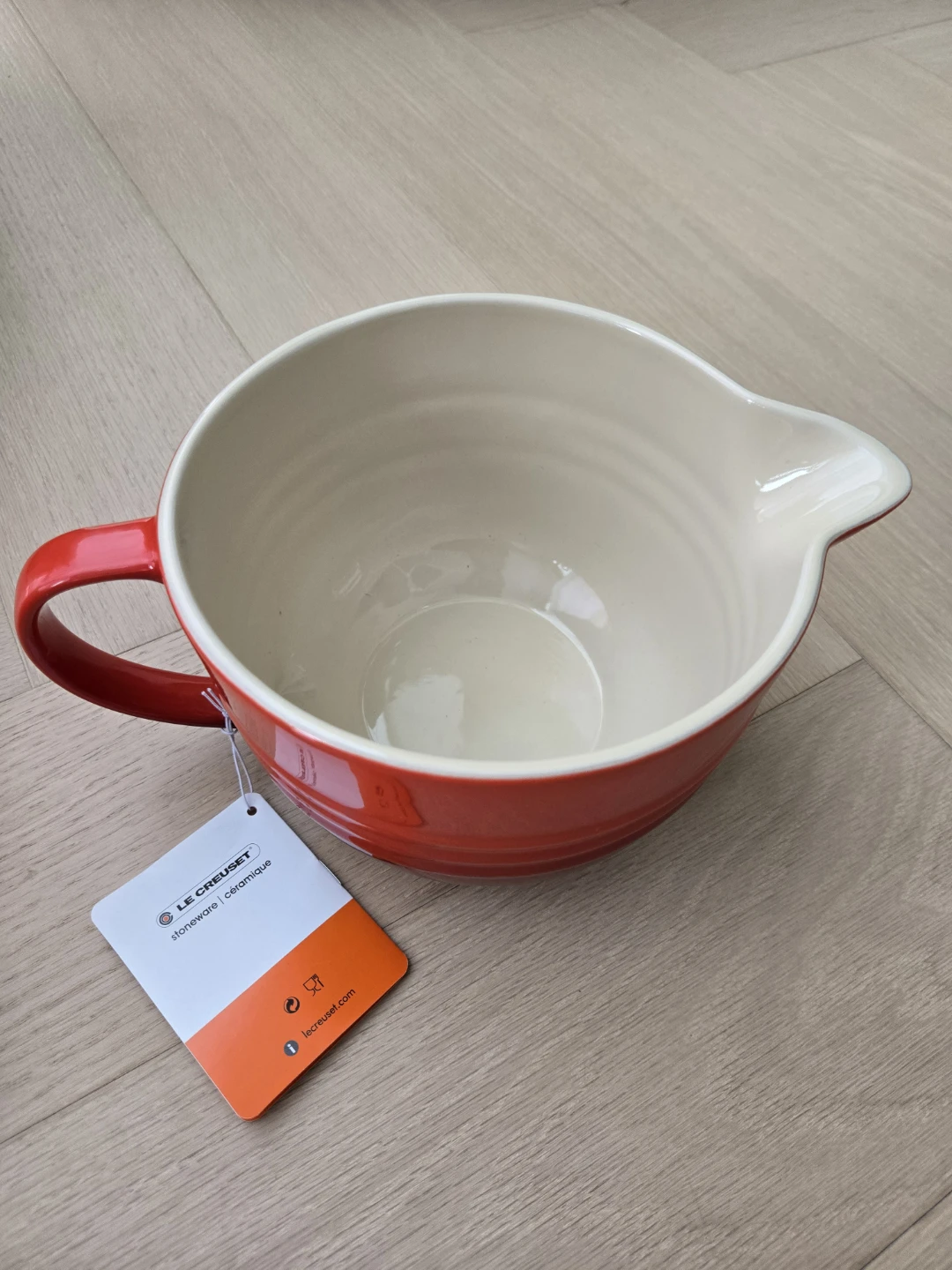This Le Creuset mixing bowl is made of durable stoneware. It features a convenient handle and a pour spout for easy use. Includes original box.