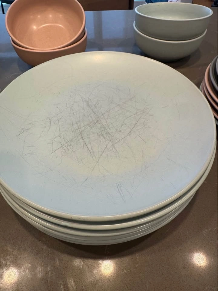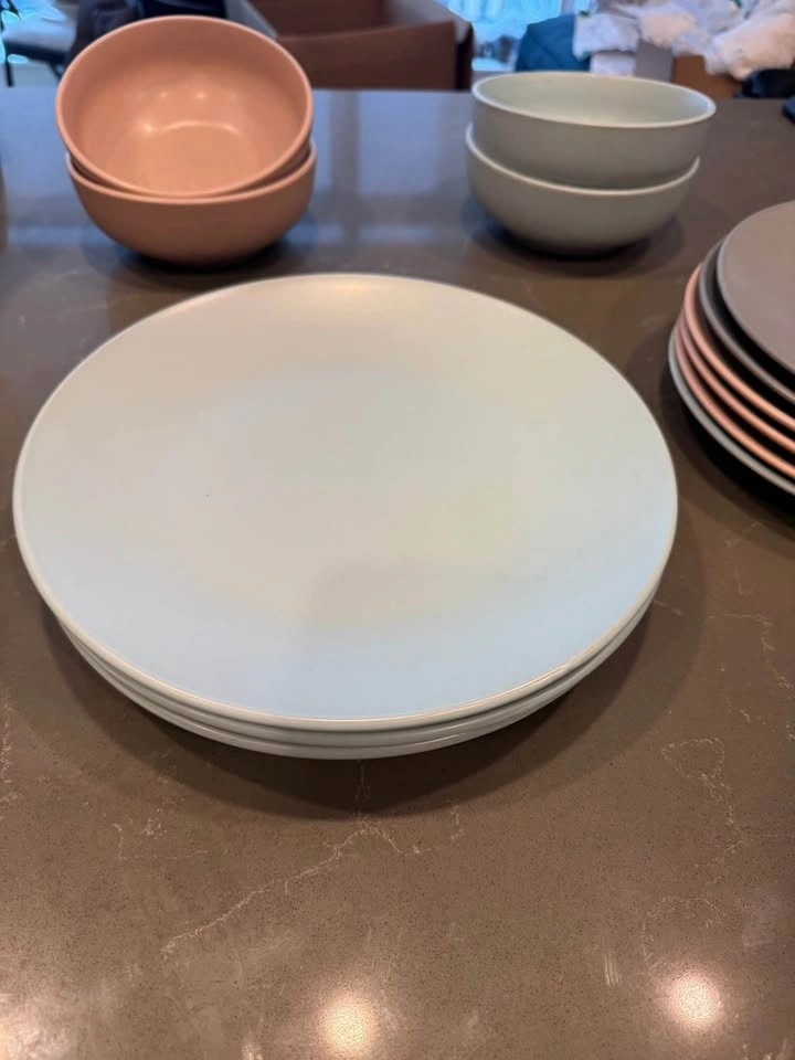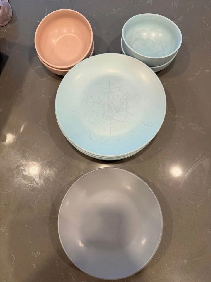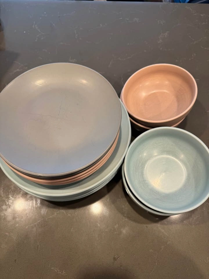 Mismatched plate set with 6 dinner plates, 6 small plates, and 4 bowls. Some marking on the dishes from use. Pick up downtown Victoria.