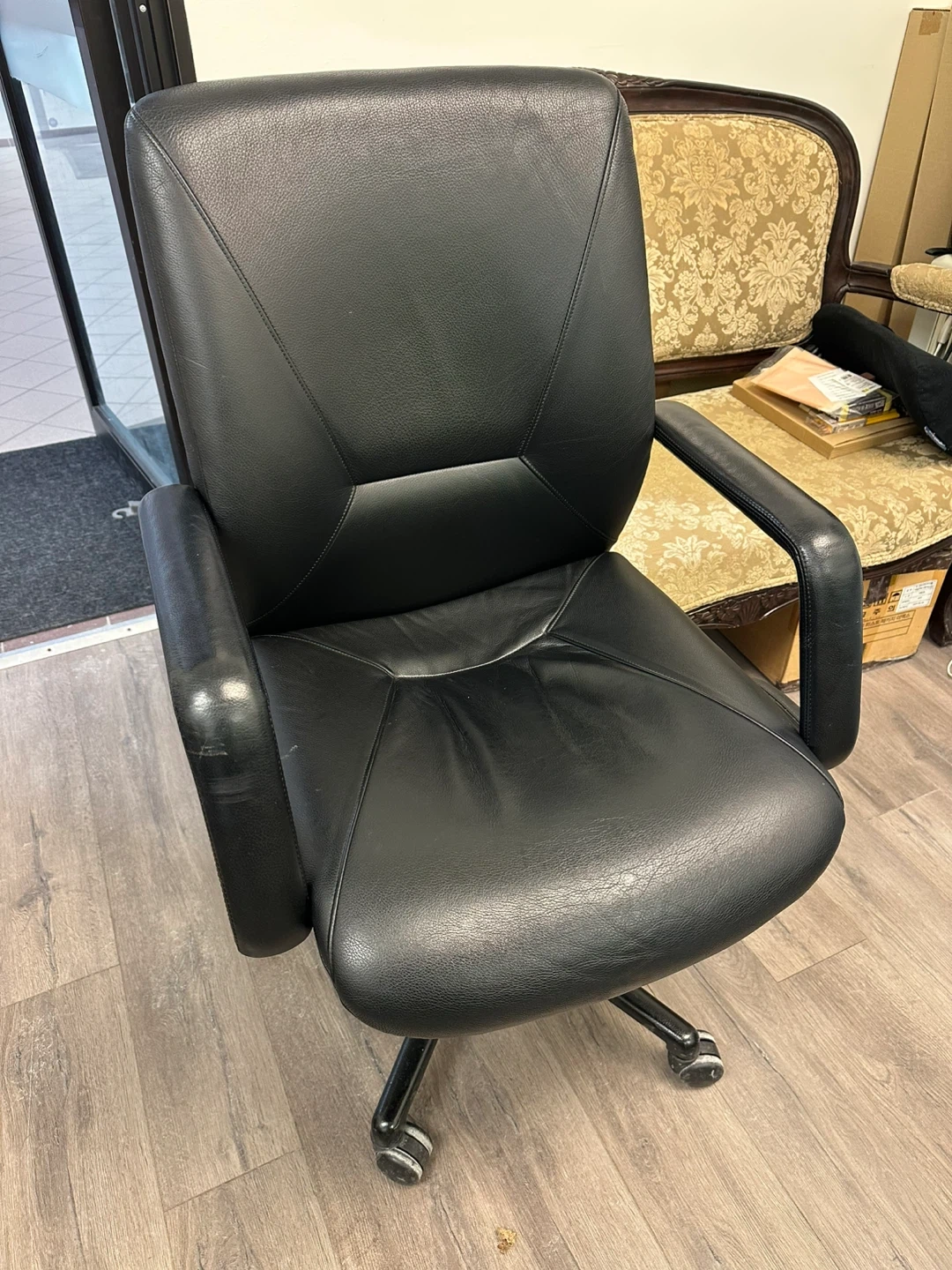 This is a black leather office chair with a five-star base and wheels. It has adjustable height and lumbar support. This chair is suitable for a home office or commercial setting.