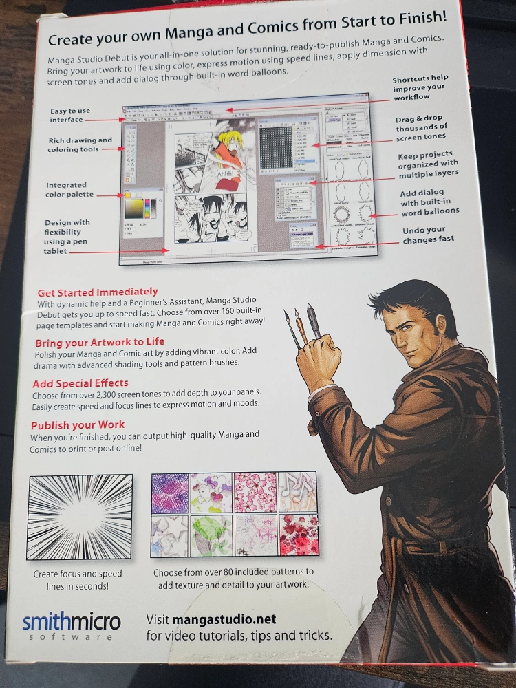 Create your own manga and comics. Easy-to-use drawing, inking and coloring tools. Includes 160 built-in templates and a beginner's assistant. Add vibrant color, drama with advanced shading tools and pattern brushes. Publish high-quality manga and comics.
