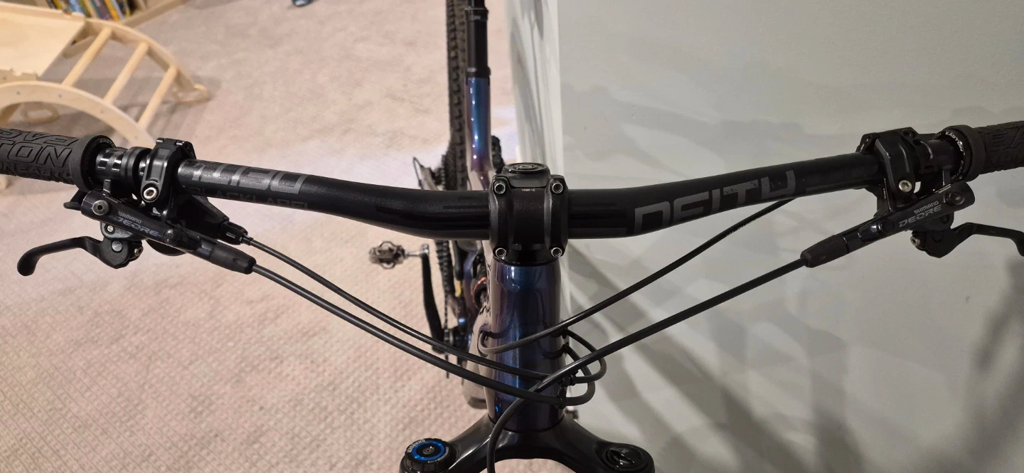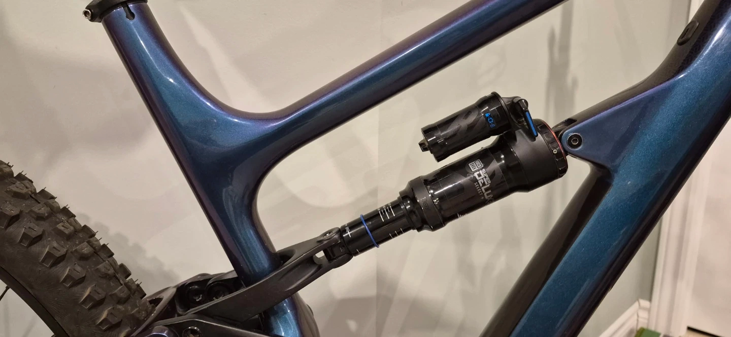 Carbon frame. RockShox Lyrik Select+ fork (150mm) with SKF seals and 2021 updates, and RockShox Super Deluxe Select+ rear shock (130mm). Deore 4-piston brakes, XT rear derailleur, and SLX shifter. 1x12 drivetrain. OneUp V2 210mm dropper post with new seals. Stans Flow EX3 wheels with Industry 9 1/1 hubs. New Continental Kryptotal tires front and rear (black). Pedals not included. All original manuals are available in digital format for the bike, suspension, and rear hub, including rebuild manuals.