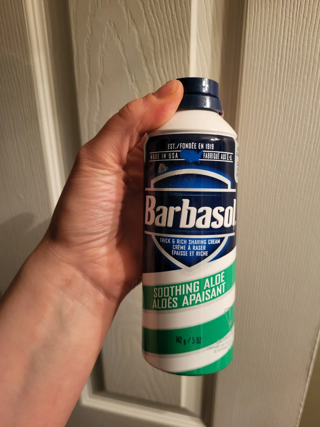 Barbasol thick & rich shaving cream with soothing aloe. This can contains 142g or 5 oz of shaving cream. It's made in the USA and was established in 1919. It's great for a smooth shave!