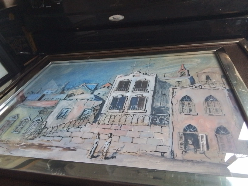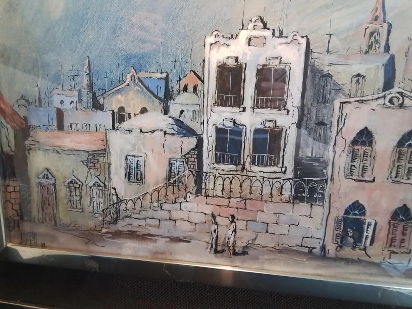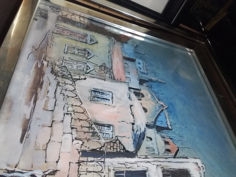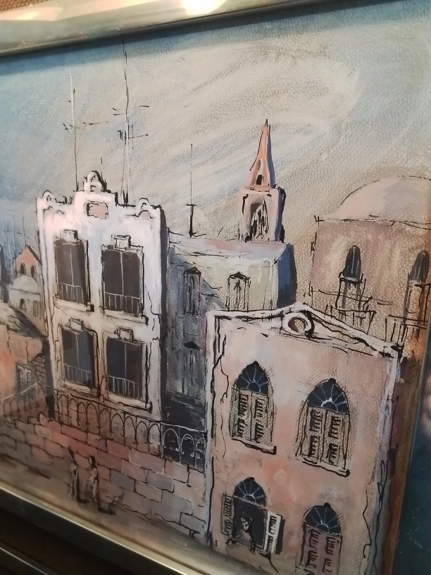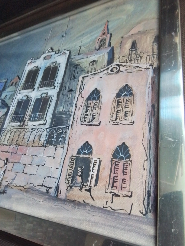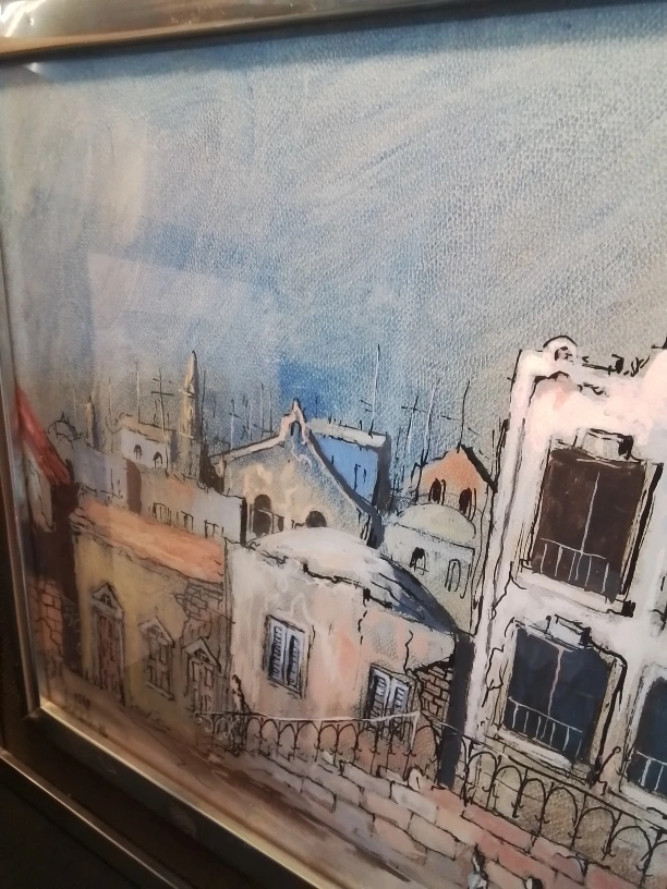 This mixed media townscape painting, signed by A. Aran in 1971, captures a unique artistic vision with its intricate details and vibrant colors. The painting is in good condition, showcasing the artist's skill and creativity. The painting is framed, adding to its vintage appeal. This artwork would be a great addition to any art collection.