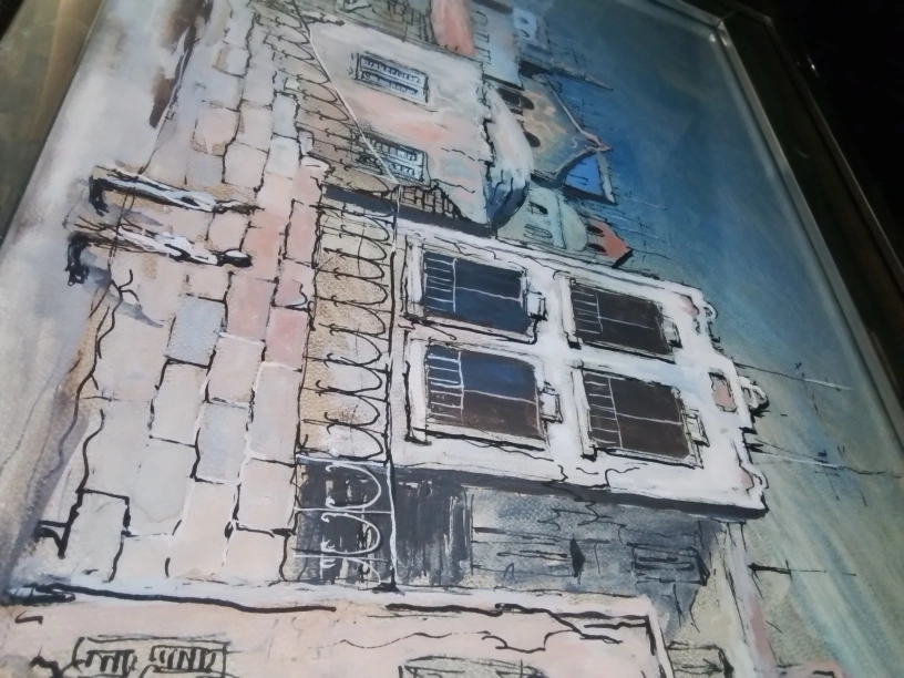 A charming cityscape painting with a silver frame! The artwork features a detailed depiction of buildings and streets, rendered in soft, muted colours. The frame is in great shape and ready to hang. It would be a lovely addition to any room!