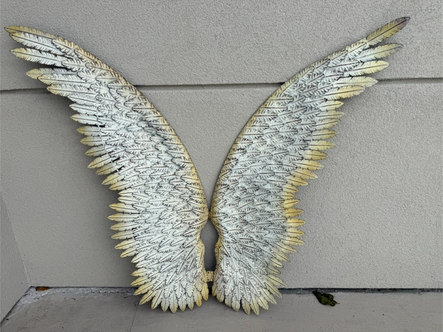 Add a touch of whimsy to your home with these decorative metal angel wings! They're perfect for adding a unique and artistic flair to any room. The wings have a lovely white and gold finish that will complement a variety of decor styles. They're in great condition and ready to be hung on your wall!