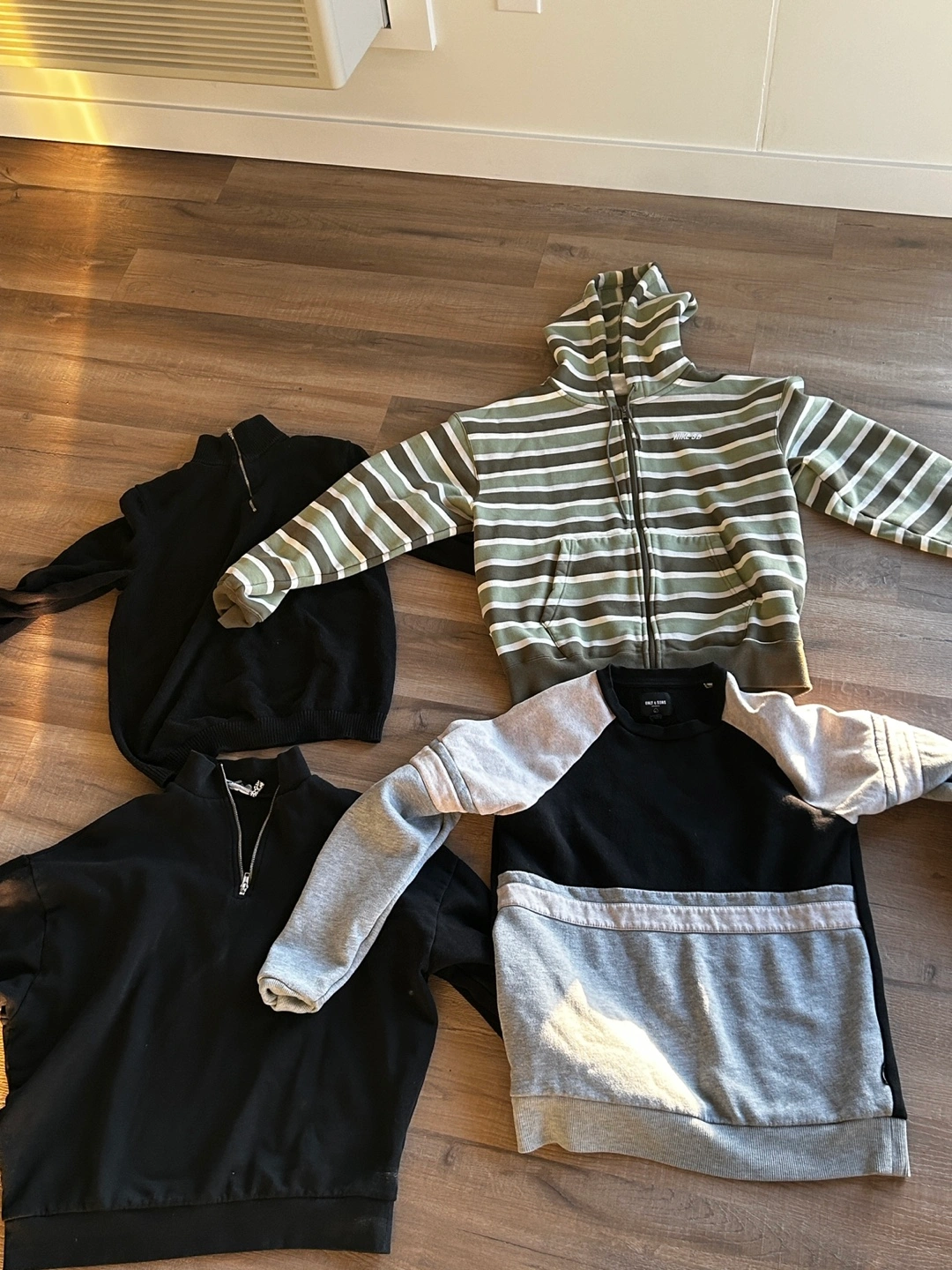 Four men's sweatshirts, various colours and styles. Includes one hooded zip-up sweatshirt with stripes, two black quarter-zip sweatshirts and one grey and black sweatshirt. Good condition.
