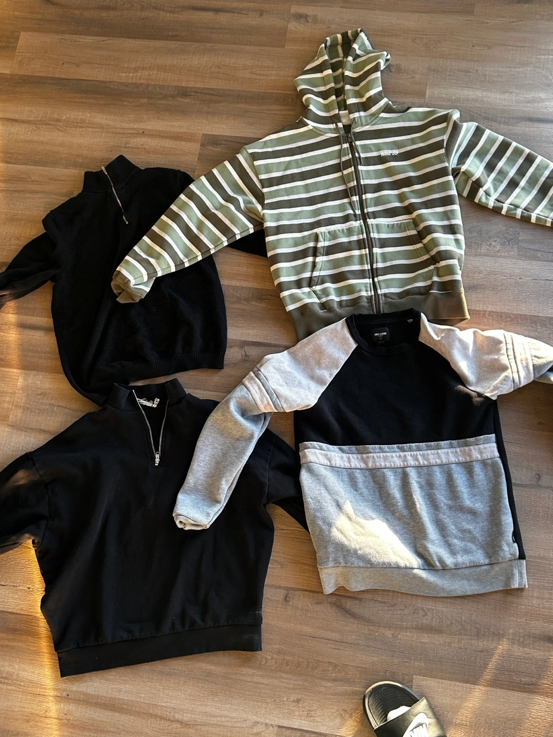 Four men's sweatshirts, various colours and styles. Includes one hooded zip-up sweatshirt with stripes, two black quarter-zip sweatshirts and one grey and black sweatshirt. Good condition.