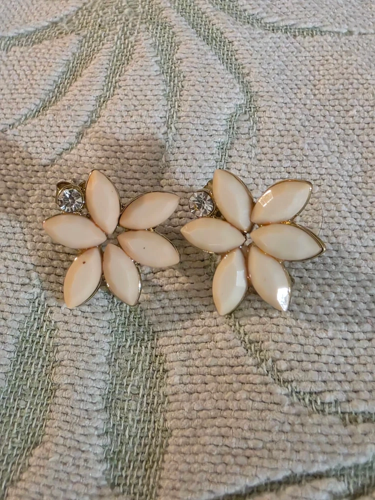 Selling a pair of flower design earrings. These earrings have a flower petal design with a small gem in the centre. They are in great condition and would be a lovely addition to any outfit!