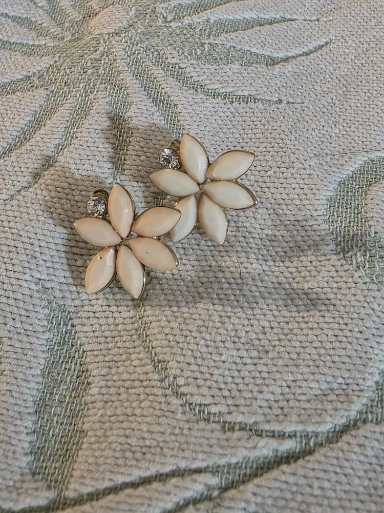 Selling a pair of flower design earrings. These earrings have a flower petal design with a small gem in the centre. They are in great condition and would be a lovely addition to any outfit!