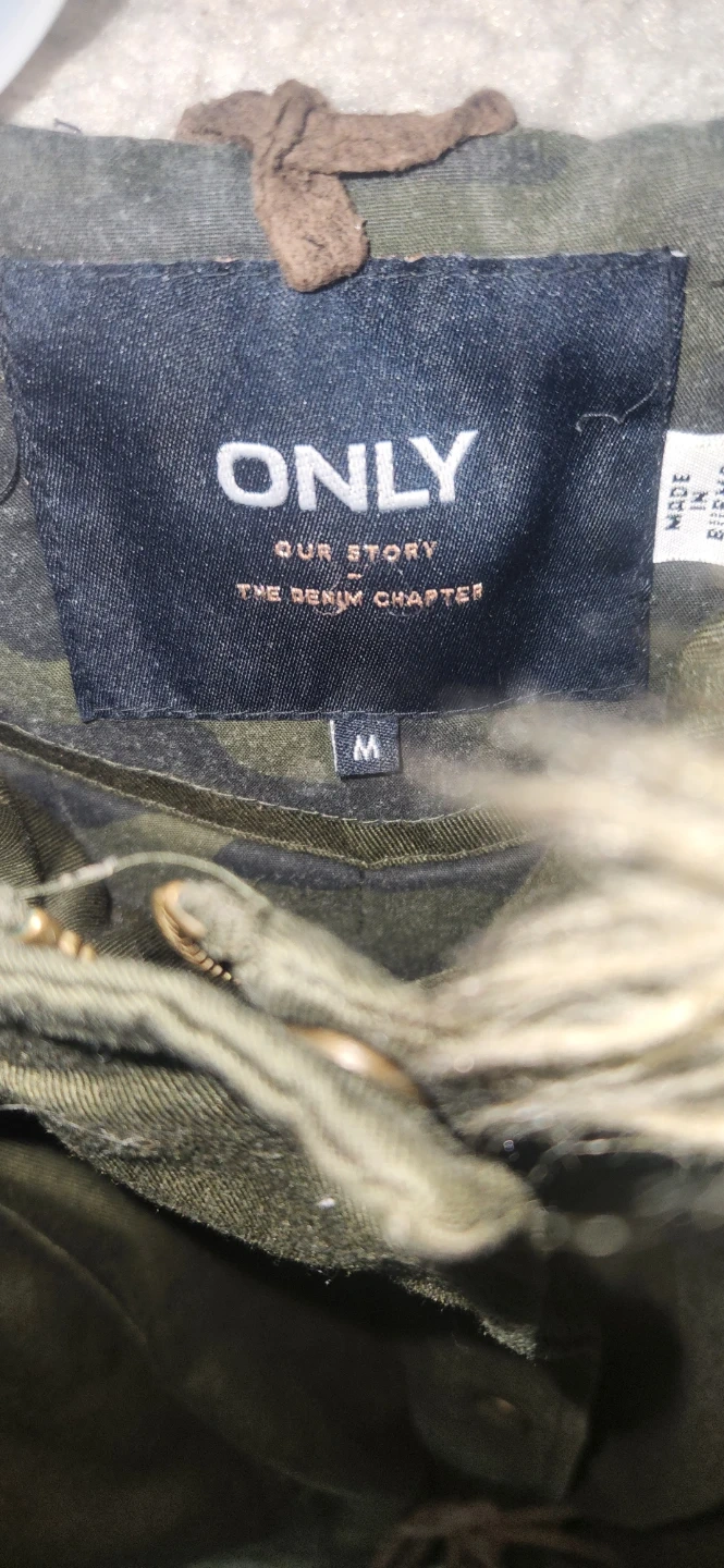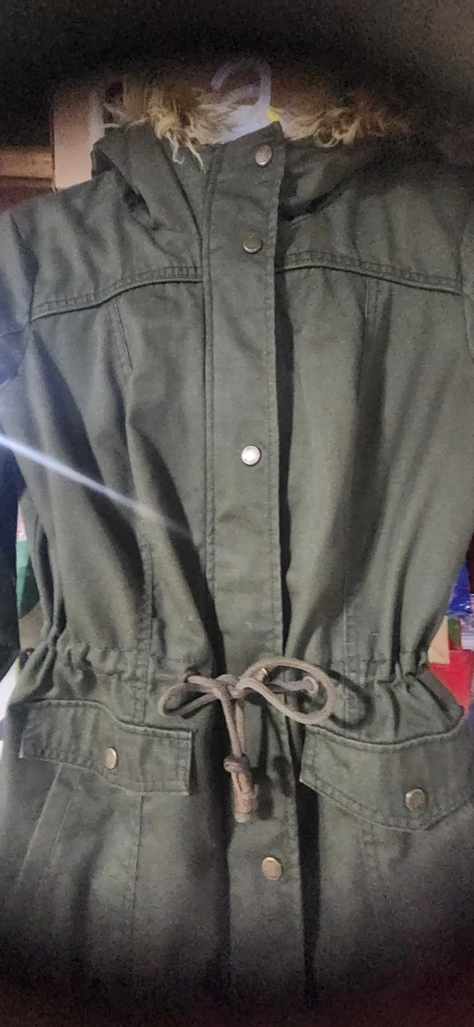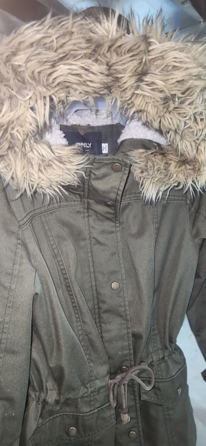Cozy olive green winter parka from ONLY, perfect for those chilly days! It has a faux fur-trimmed hood and a drawstring waist for a flattering fit. Size is M.