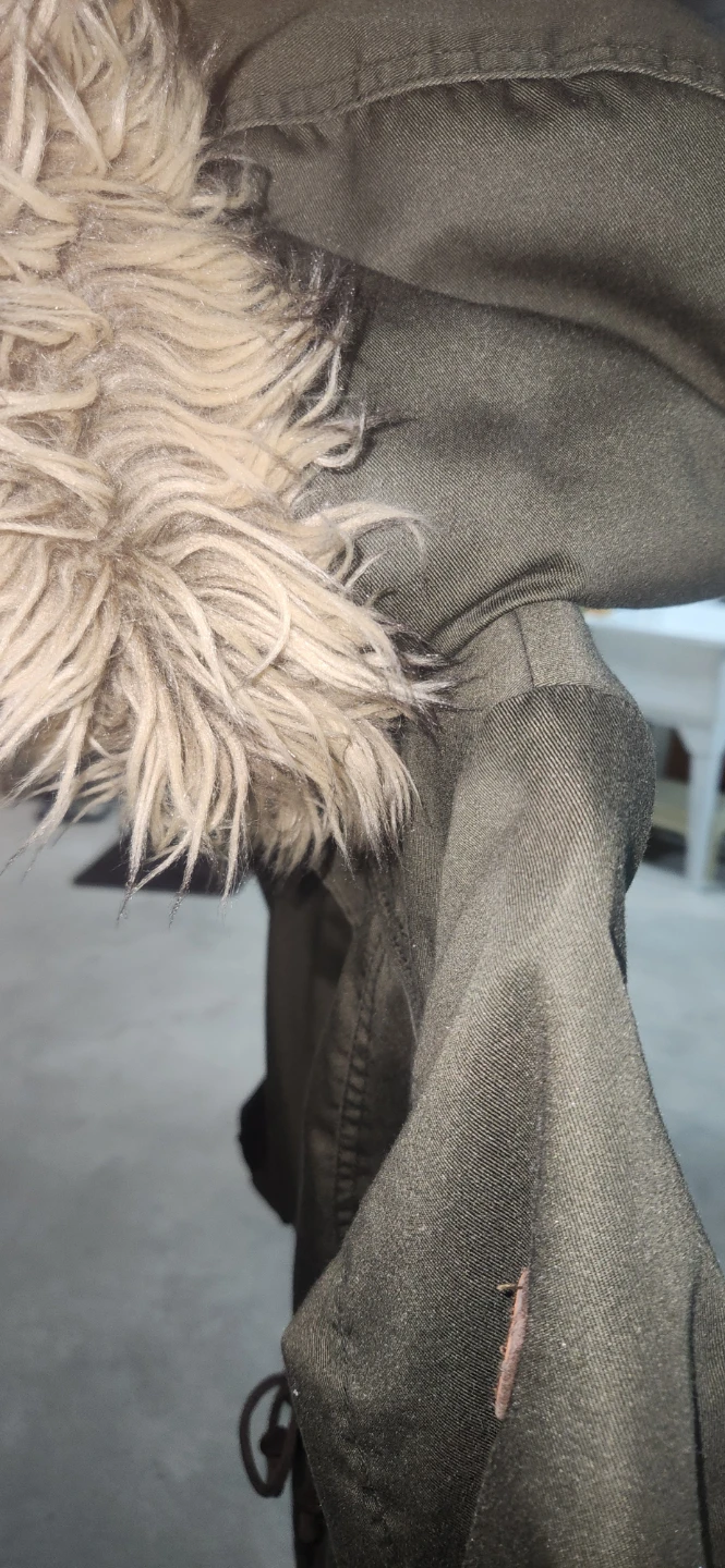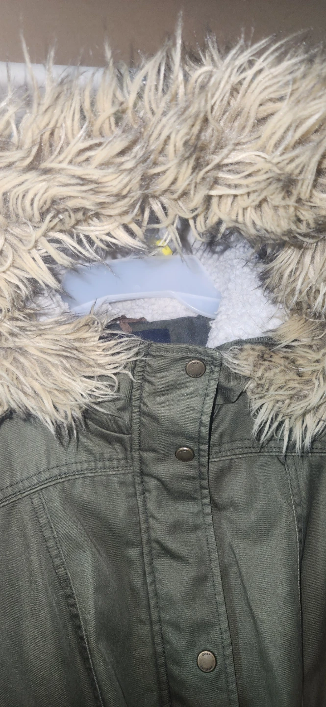 Cozy olive green winter parka from ONLY, perfect for those chilly days! It has a faux fur-trimmed hood and a drawstring waist for a flattering fit. Size is M.