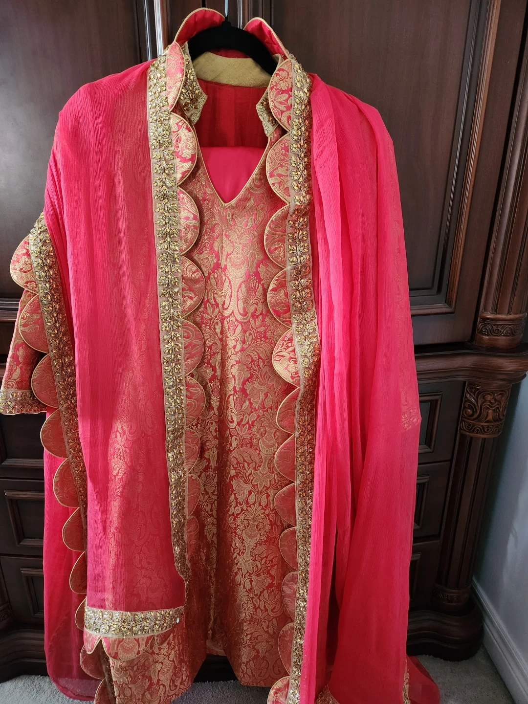 Beautiful pink and gold salwar kameez, perfect for a special occasion! The embroidery is very detailed and the fabric is lightweight and comfortable. It's in great condition and ready for a new home! Kundan work on pure brocade with pure chiffon duppata matching mundane work.