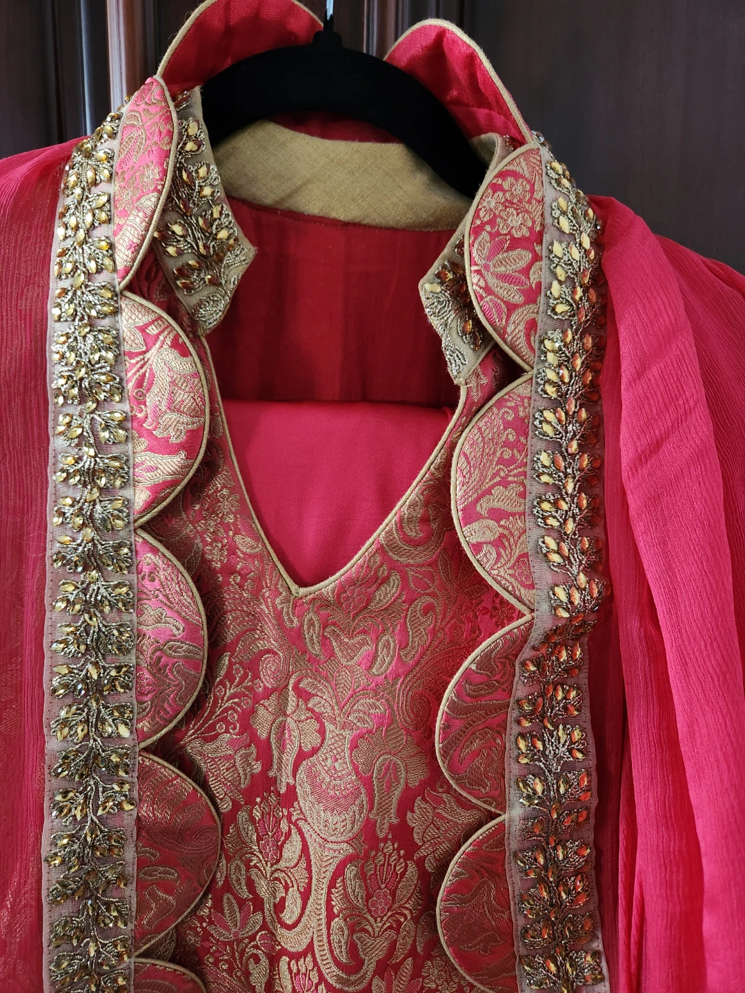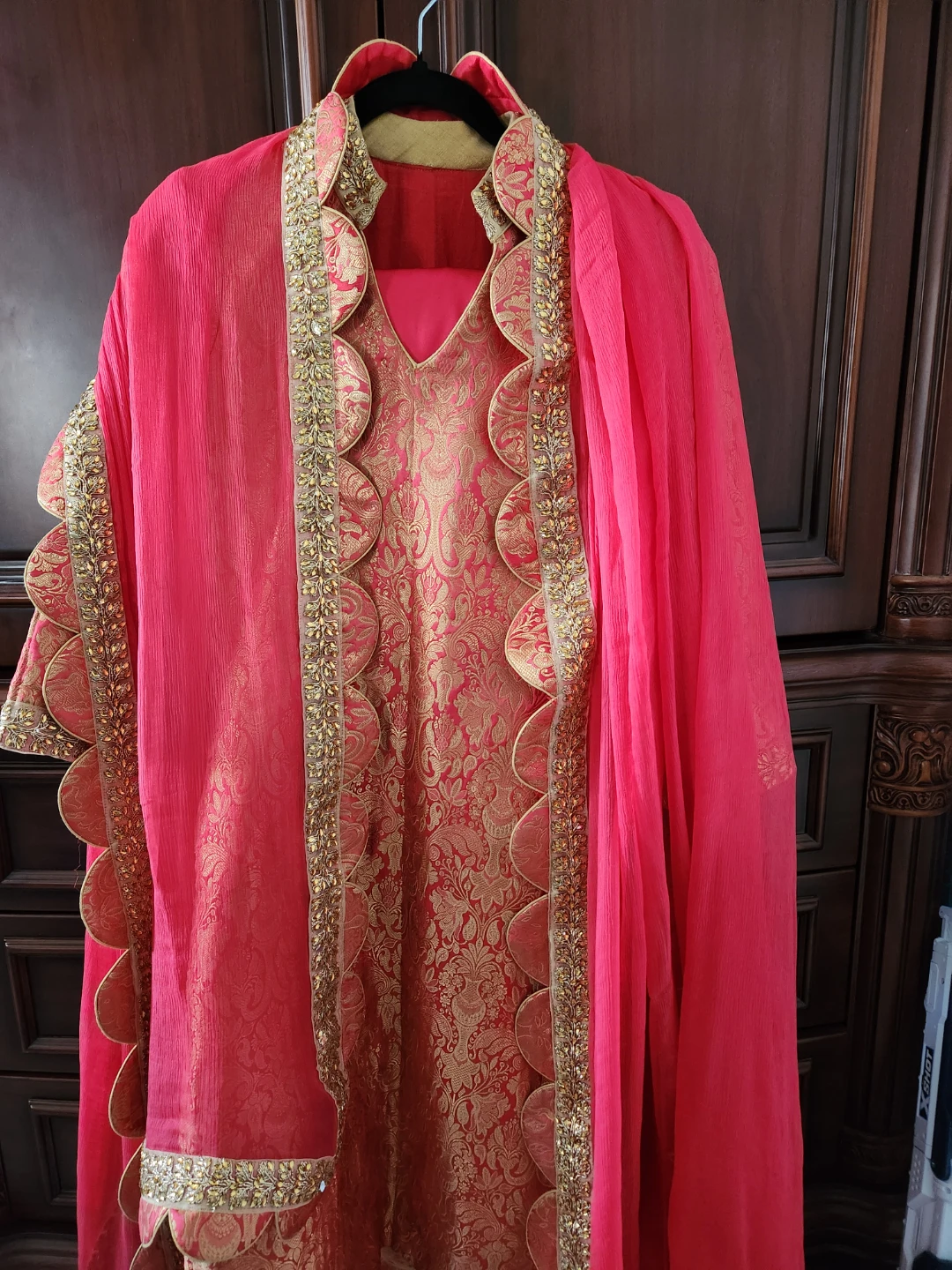 Beautiful pink and gold salwar kameez, perfect for a special occasion! The embroidery is very detailed and the fabric is lightweight and comfortable. It's in great condition and ready for a new home! Kundan work on pure brocade with pure chiffon duppata matching mundane work.