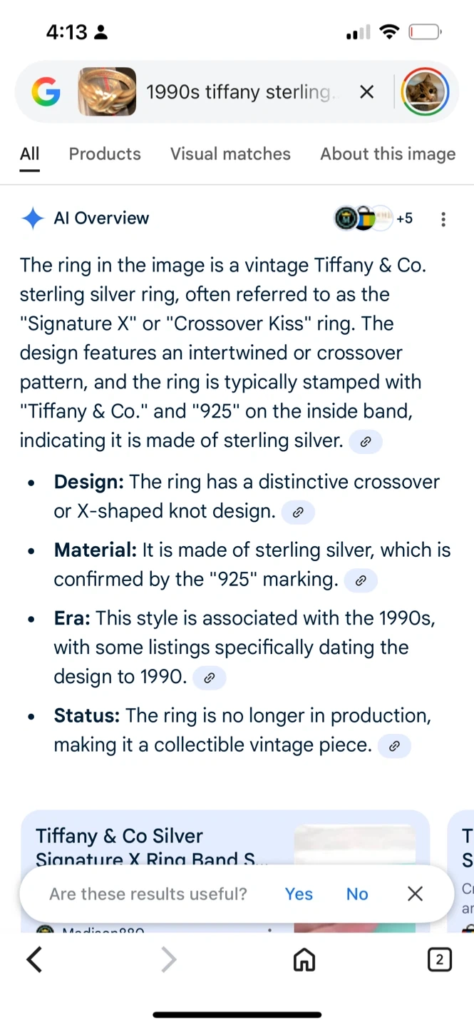 Selling a Tiffany & Co. Sterling Silver Crossover Kiss Ring from 1990. It's a size 5 and made of sterling silver, with a distinctive crossover or X-shaped knot design. The ring is typically stamped with "Tiffany & Co." and "925" on the inside band, indicating it is made of sterling silver