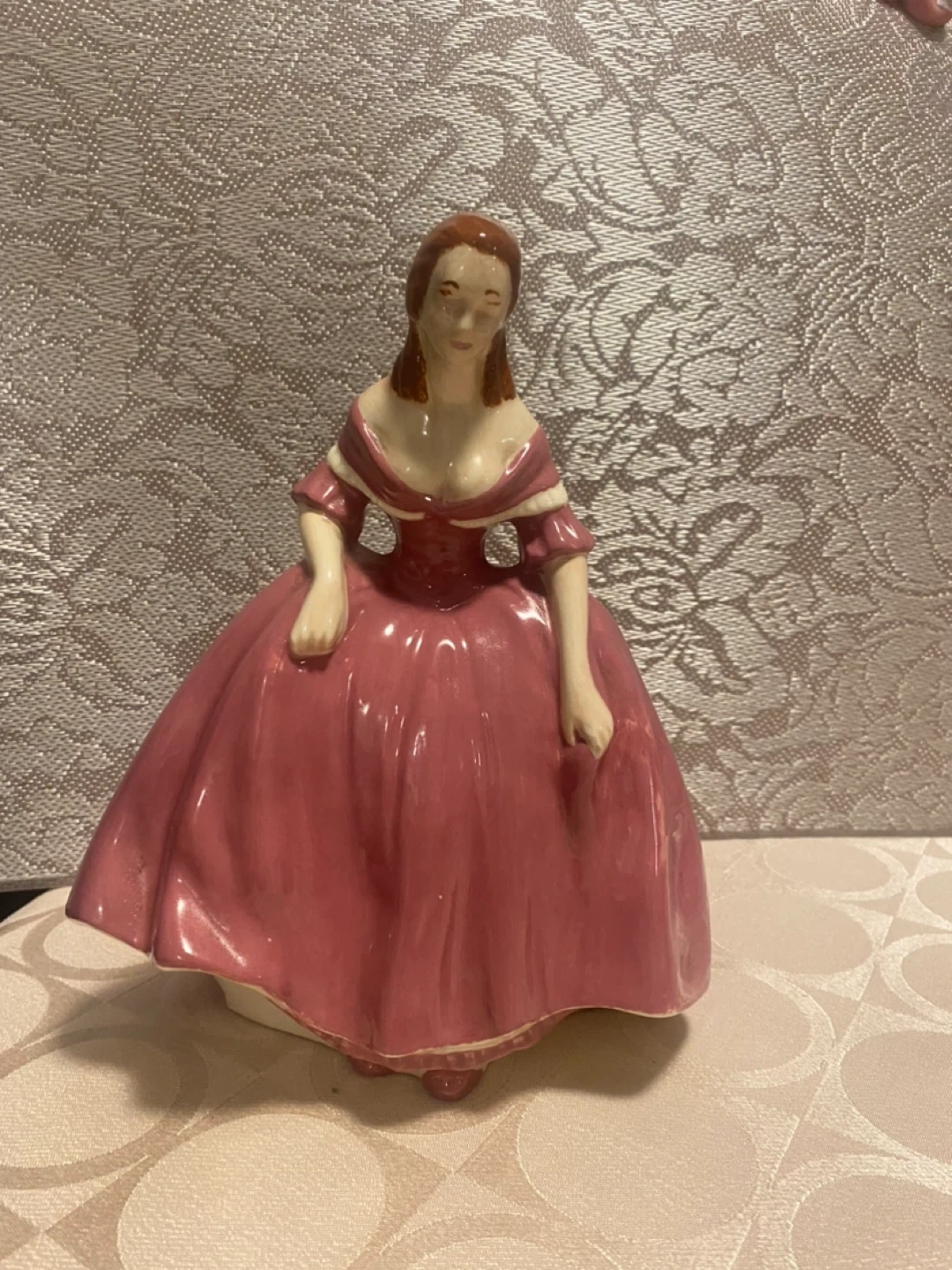 This is a charming porcelain figurine of a woman in a pink Victorian-style dress. It's crafted with delicate detail. A lovely decorative piece for any home!