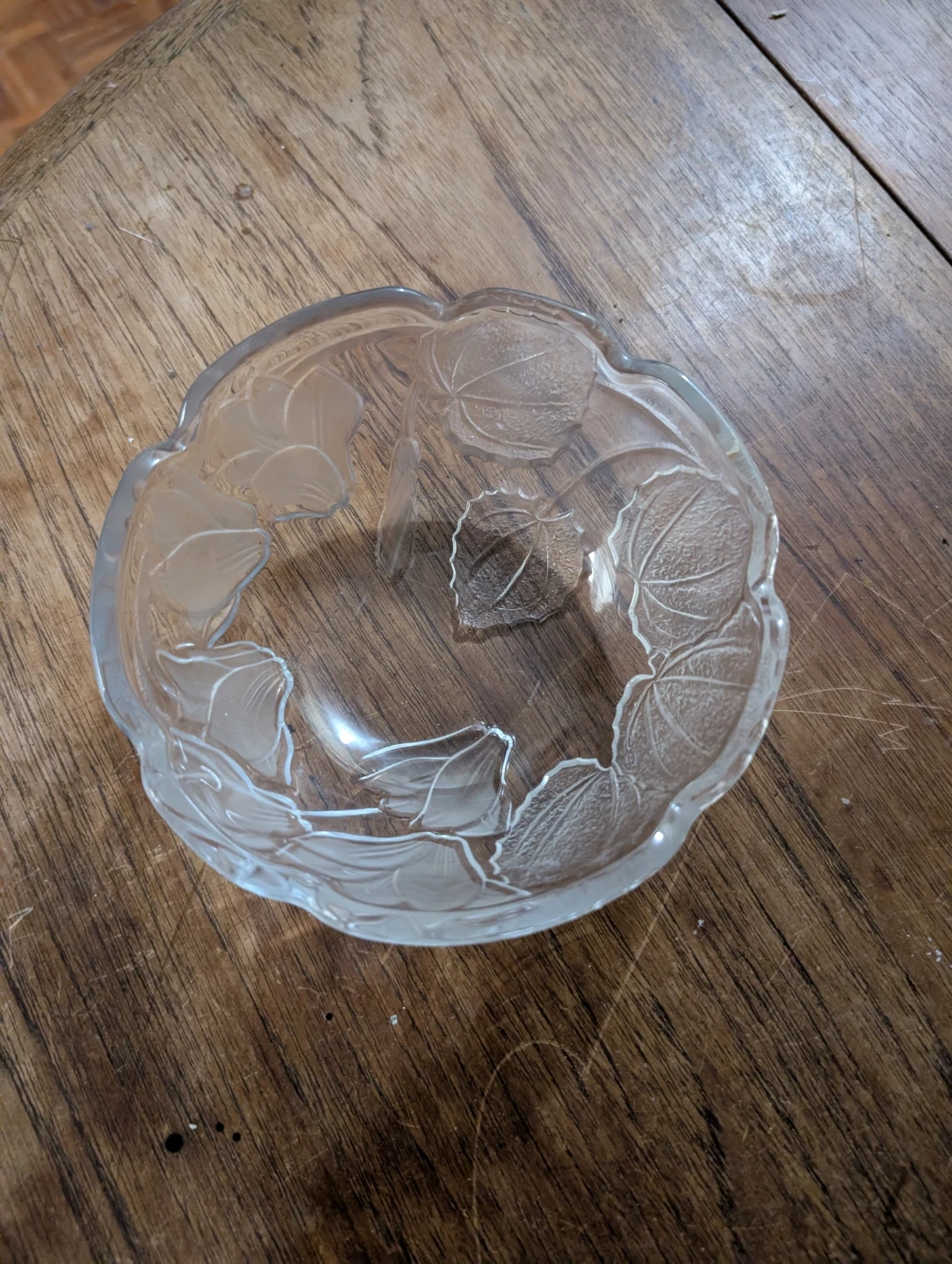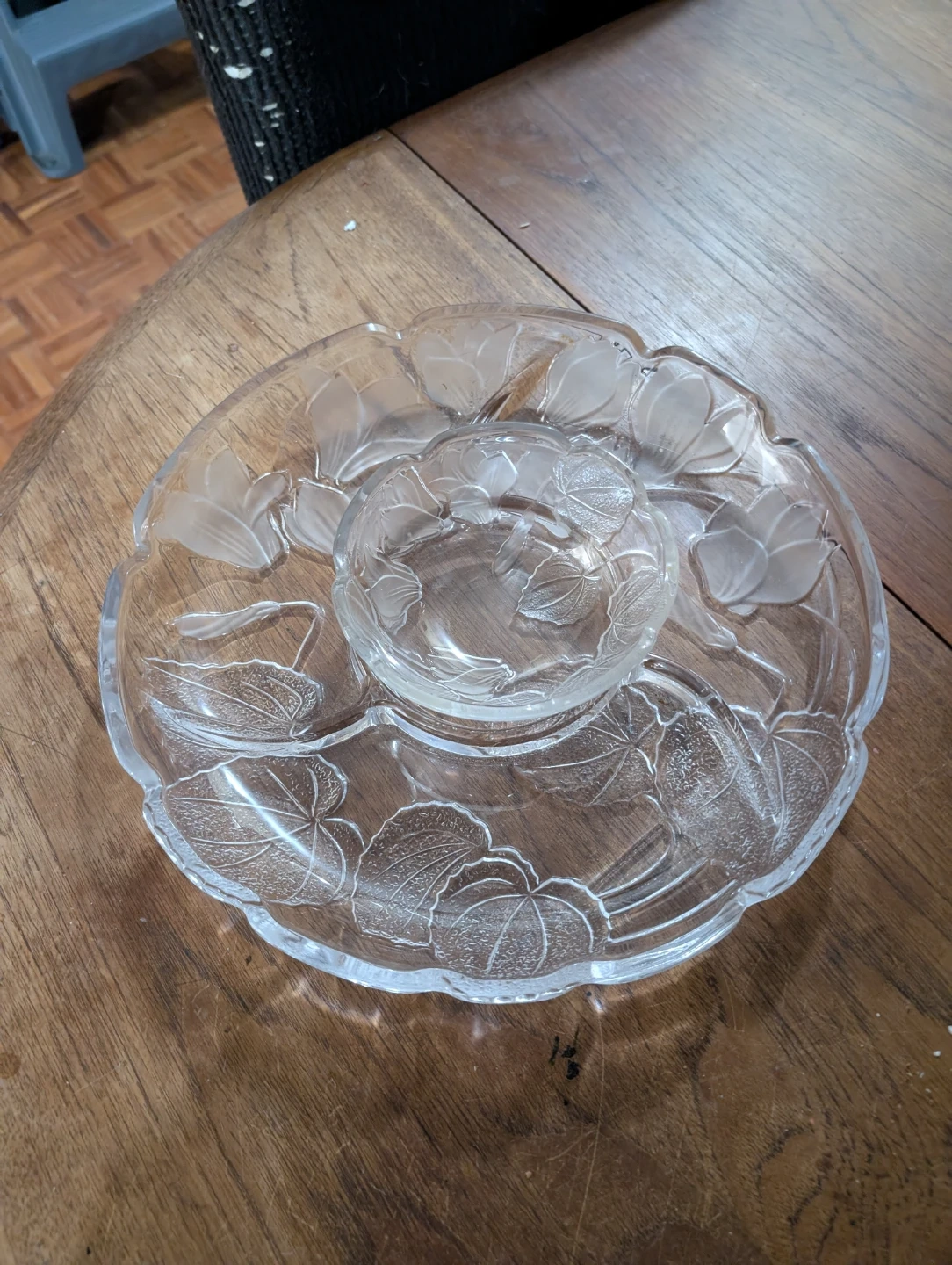 Clear glass serving platter with a frosted floral and leaf design. It includes a removable glass dip bowl that fits in the centre. Perfect for serving appetizers or snacks at a party!