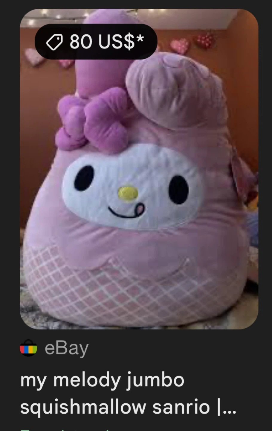 Buy & SellMy Melody Squishmallow JumboMy Melody Squishmallow Jumbo$36Selling a super cute My Melody Squishmallow! It's in great condition and measures about 18 inches tall. Perfect for any Sanrio fan!ÉtatLike newWHERE TO MEETCheck LocationView MapSELLERverifiedInesJamaica Hills1055 reviews0 chats·1 favorites·5 viewsSEND CHAT TO SELLERHi Ines! I’m interested in your listing.Hi Ines! I’m interested in your listing.Get the Karrot app to chatSign In to chat