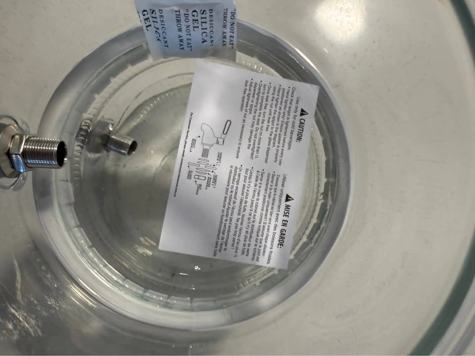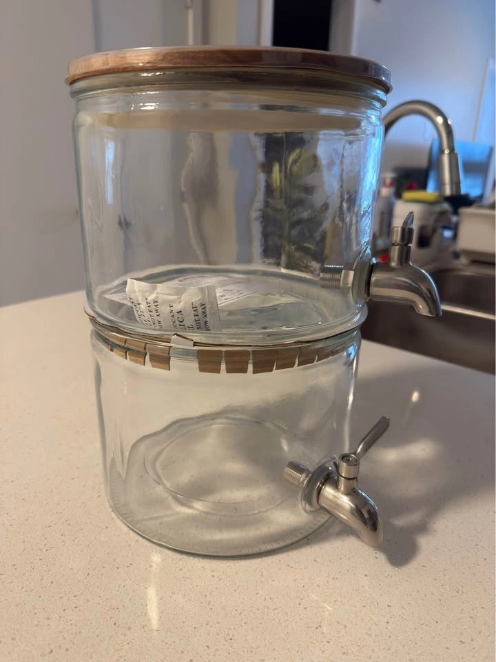 New two-tier glass beverage dispenser with two metal spigots and a wooden lid. Still has the silica packets and caution paper inside. Never used.