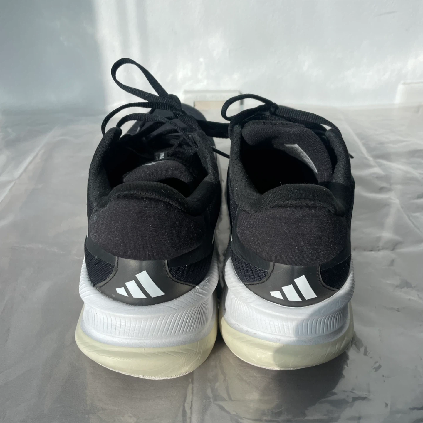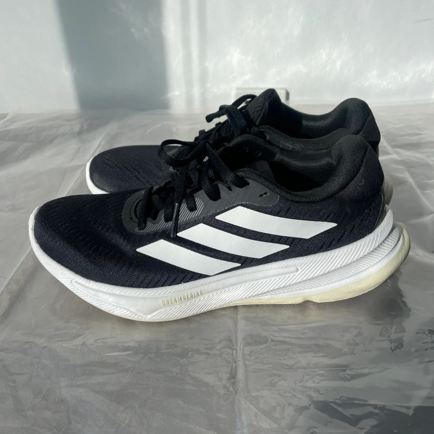 Adidas Supernova running shoes runners sneakers in black and white. They're designed with Dreamstrike technology for comfort.