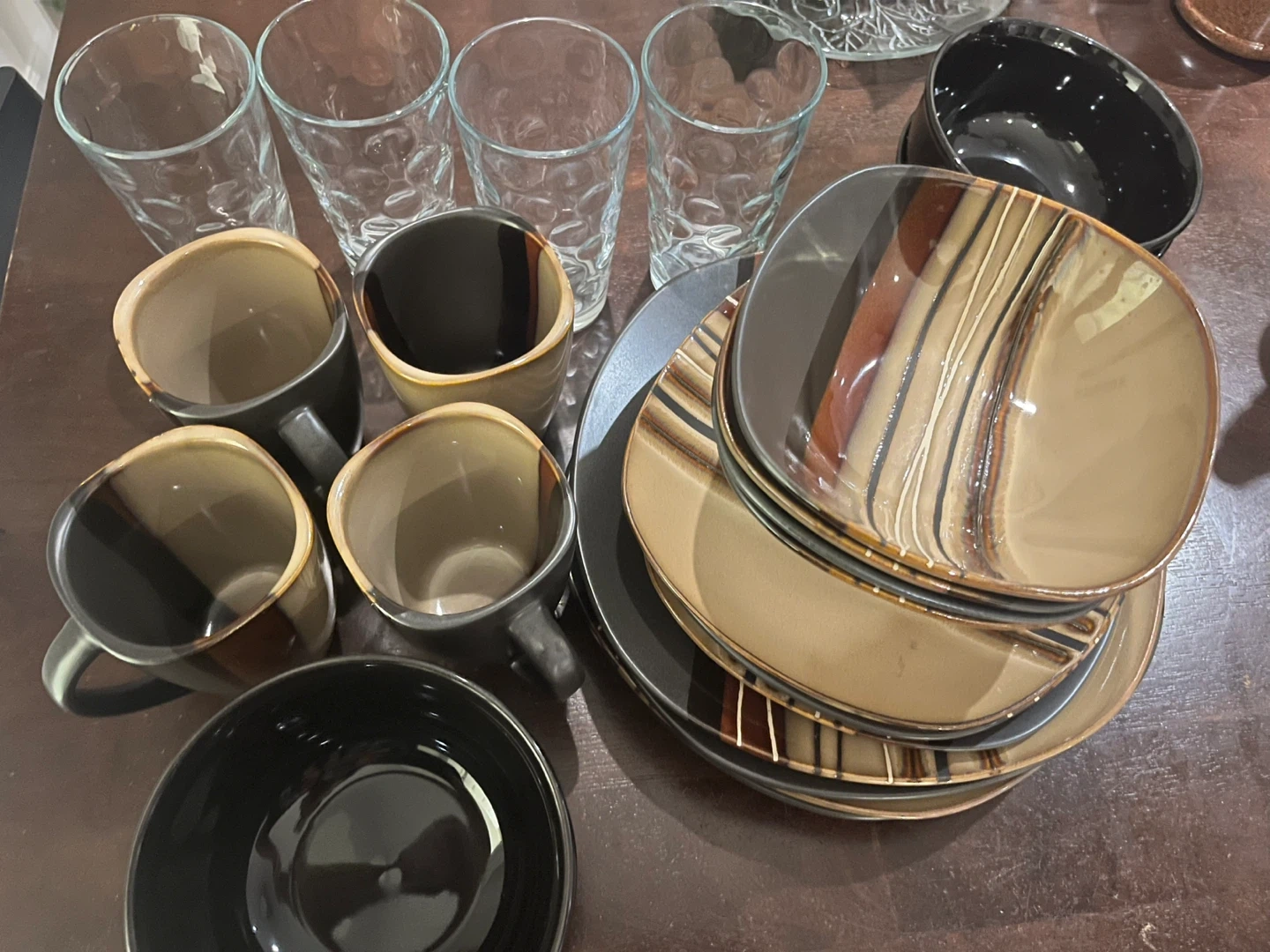 This set includes four ceramic mugs with a brown and black gradient, four clear glass tumblers with a textured pattern, and a collection of square stoneware plates and bowls in brown and black tones. It's a great set for everyday use!