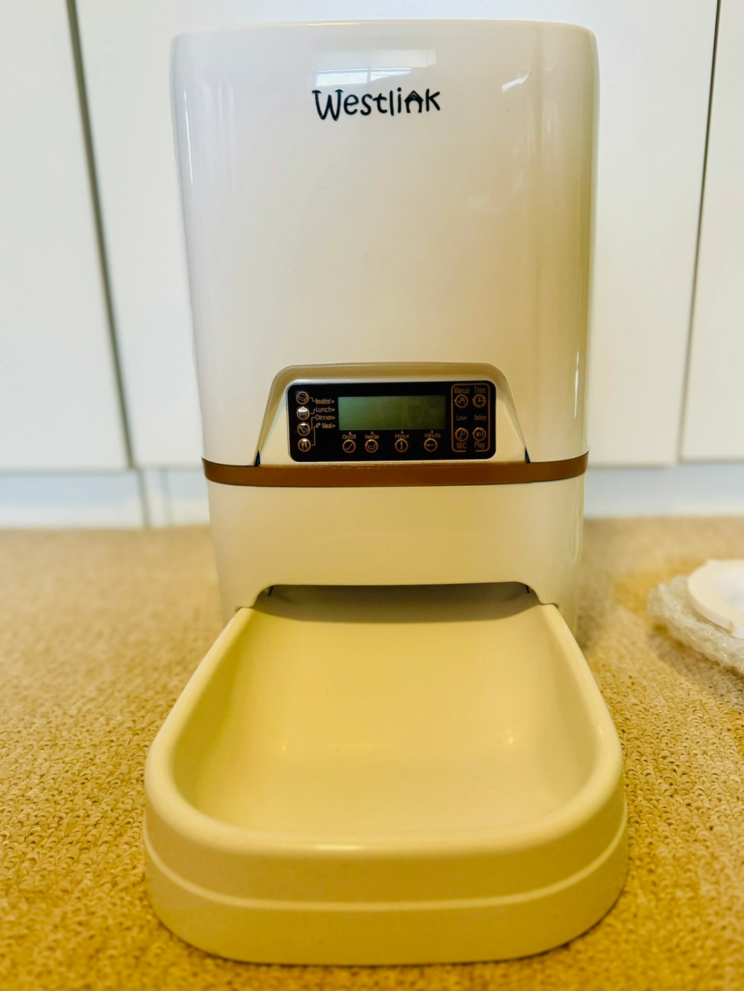 You can record your own voice to play for your pet at feeding times