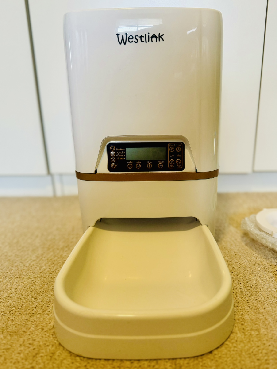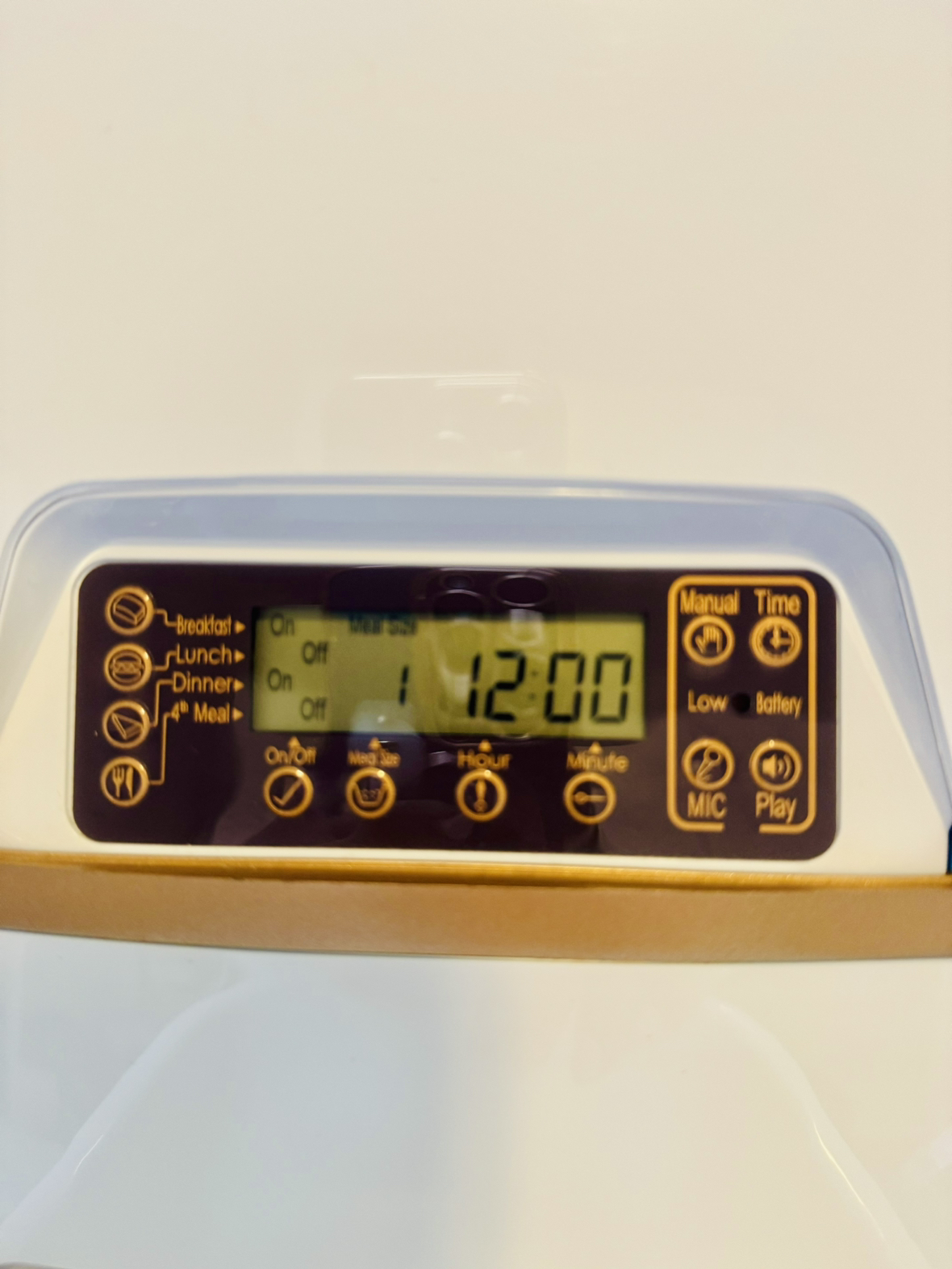 You can record your own voice to play for your pet at feeding times