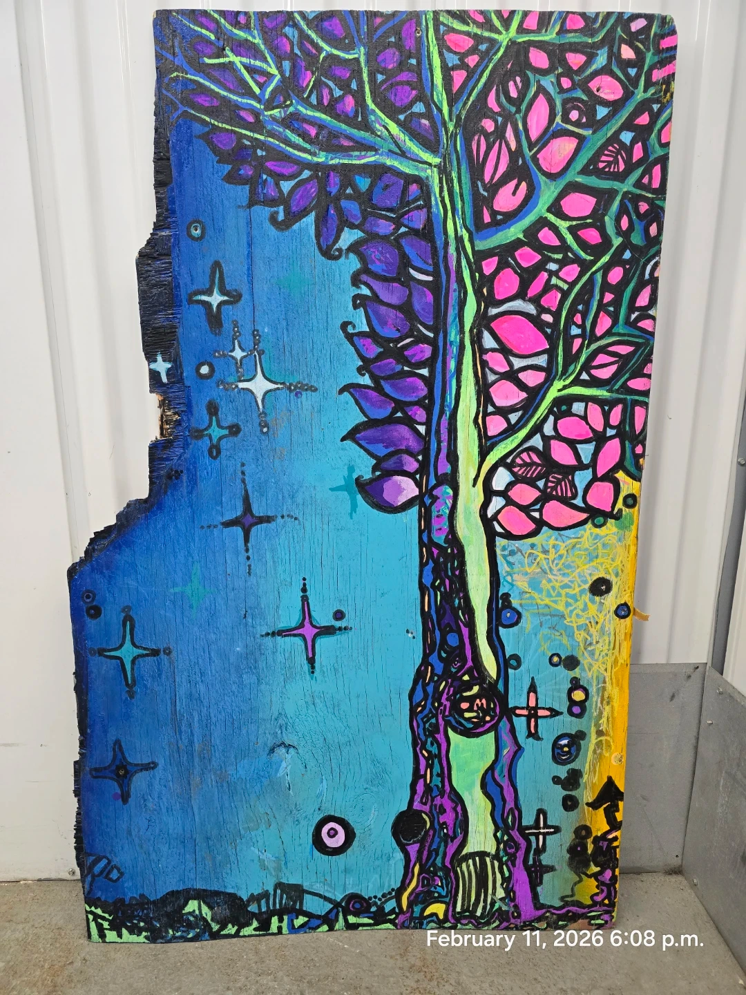 This is a unique, handmade painting featuring vibrant tree and forest scenes. It's painted on wood panels with a colourful, artistic style. Ready to add some character to any wall!