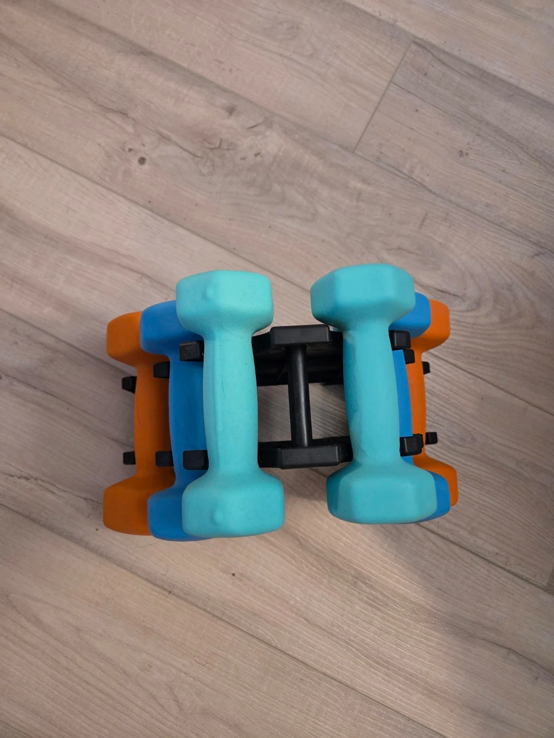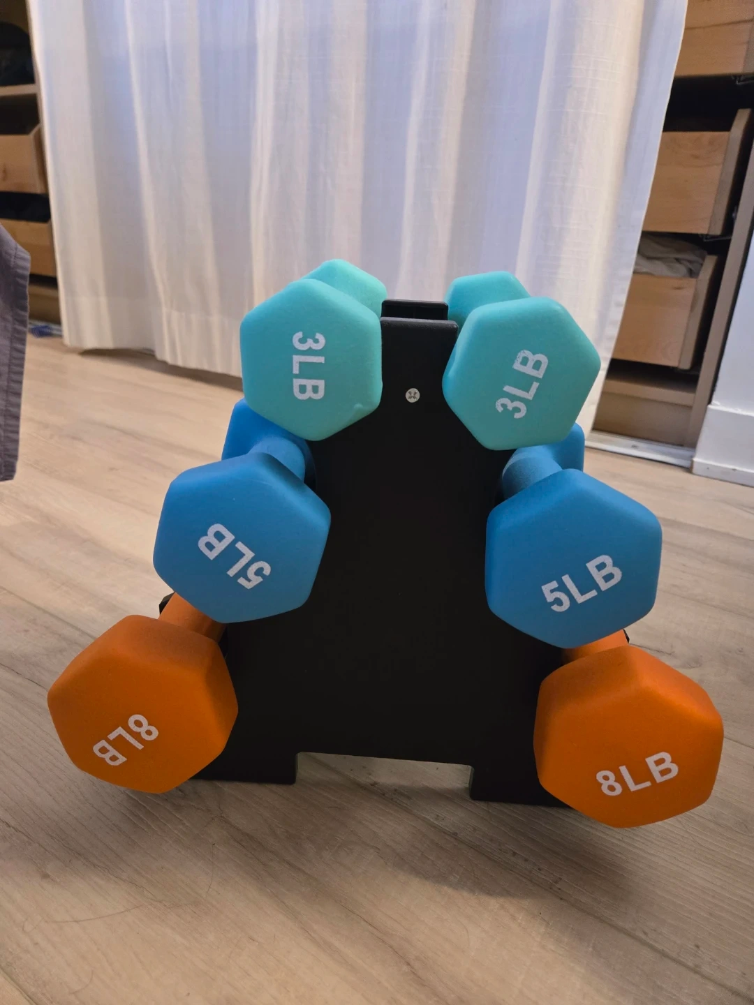 Includes two 3LB, two 5LB, and two 8LB dumbbells. This set comes with a convenient rack for storage. Weights have a comfortable, non-slip grip.