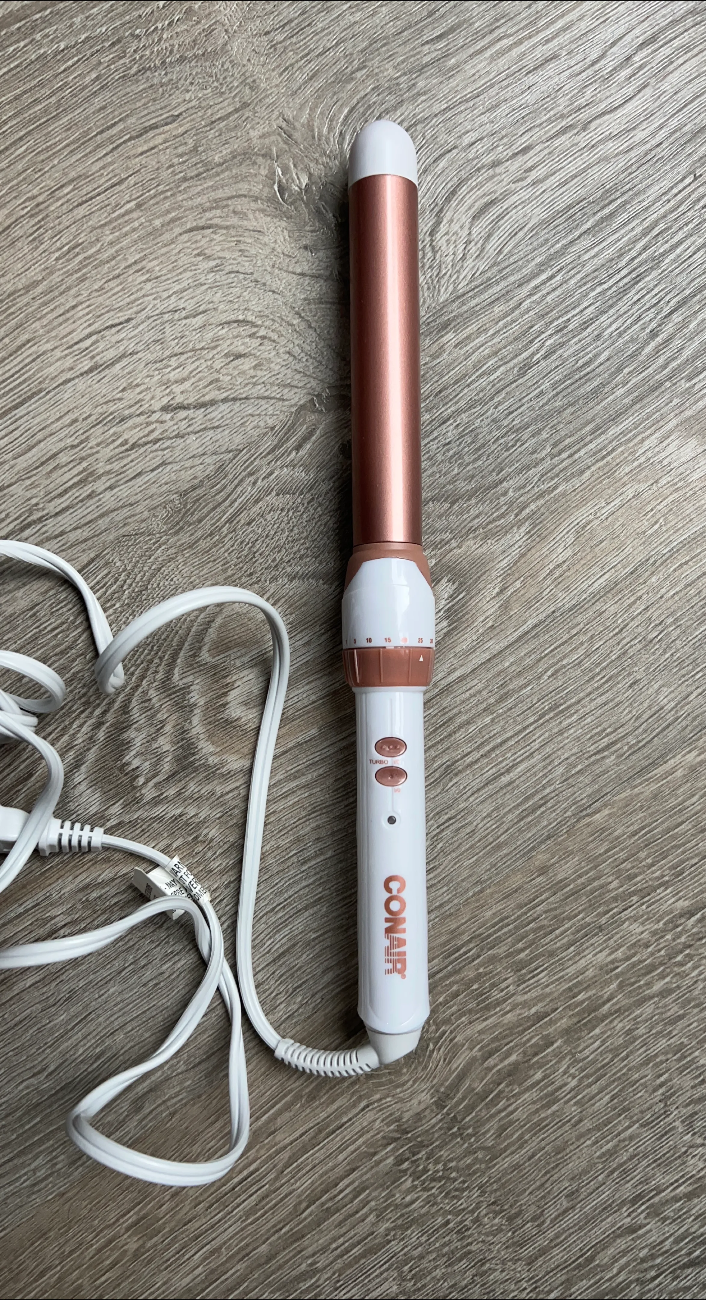 Selling a Conair curling iron in excellent condition! It features a rose gold barrel and a white handle with easy-to-use controls.