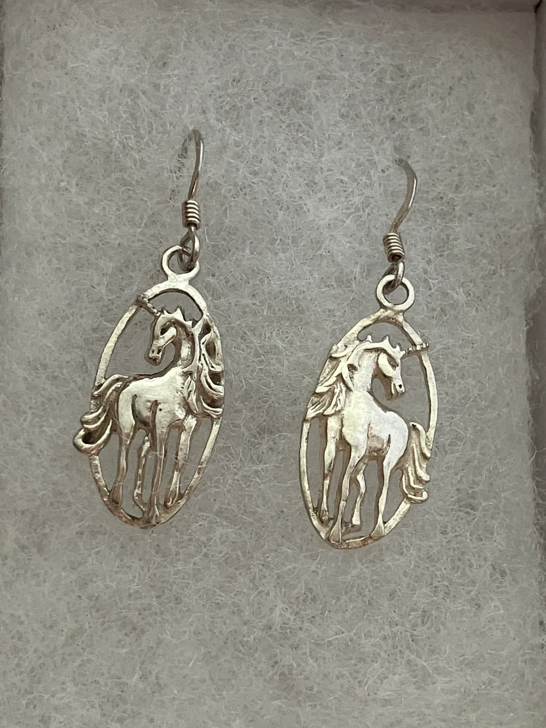 Sterling silver earrings featuring detailed horse designs within oval frames. The hooks are silver-toned metal. Earrings dangle for a stylish look.
