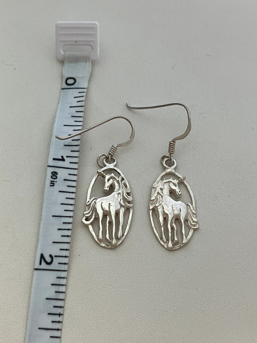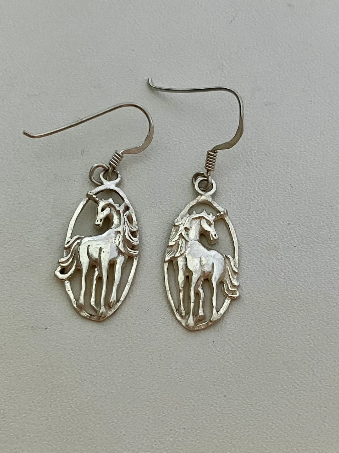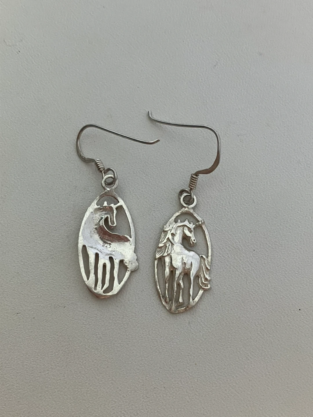 Sterling silver earrings featuring detailed horse designs within oval frames. The hooks are silver-toned metal. Earrings dangle for a stylish look.