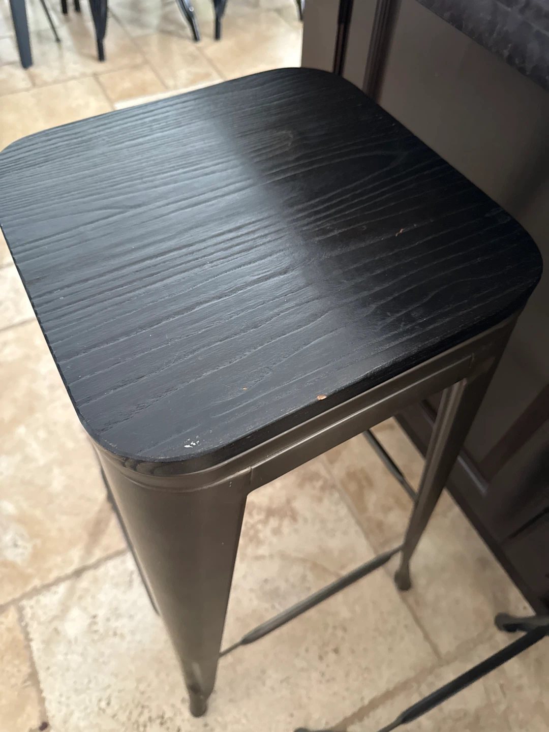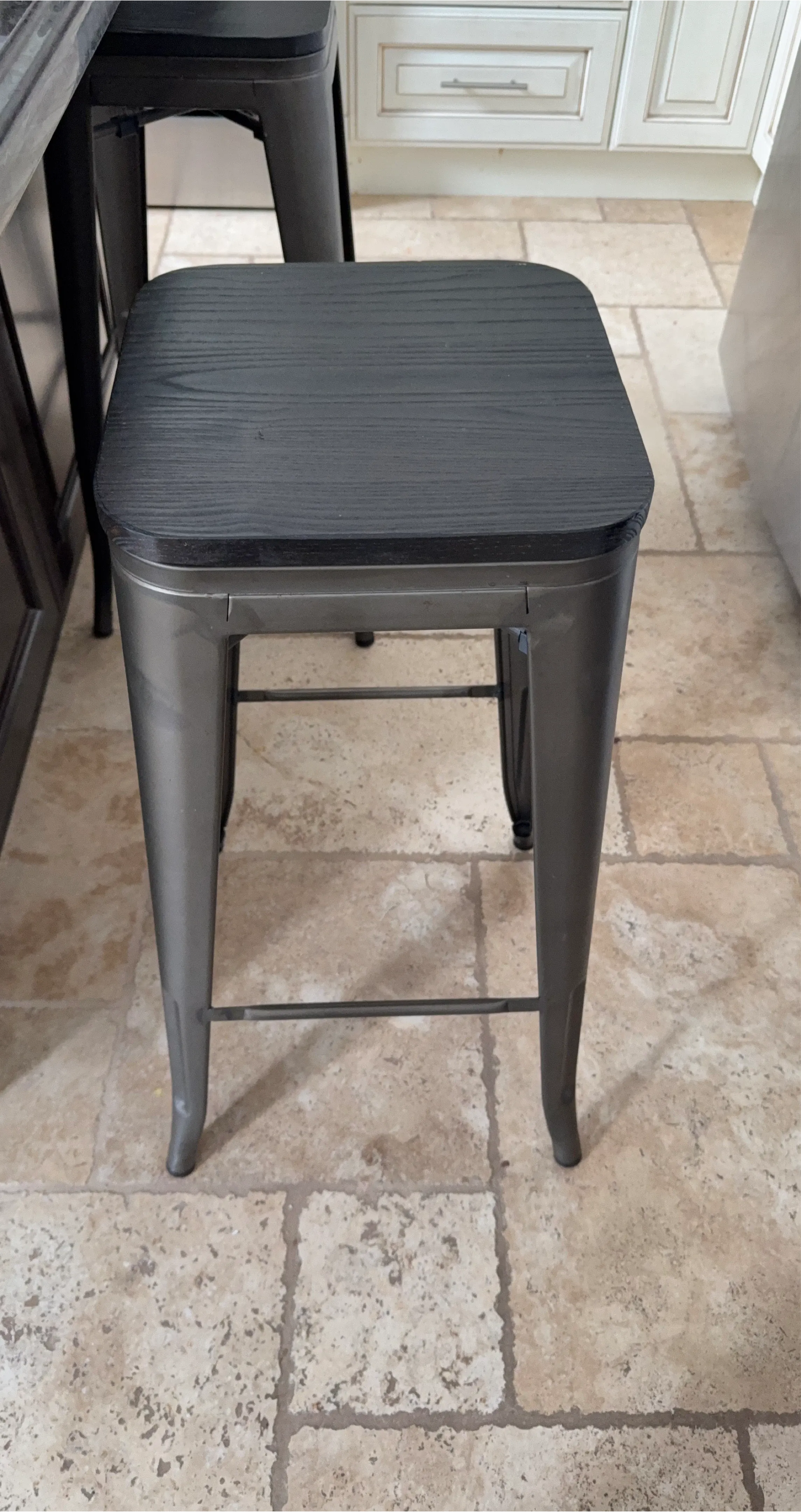 Two metal bar stools with black wood tops. These stools have a durable metal frame and a rustic wood seat. They're great for a kitchen island or home bar setup.