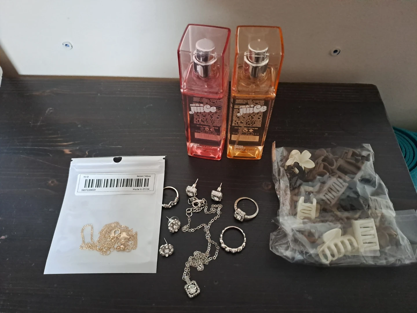 Two Juice body mists, one pink and one orange, are included with a set of various jewellery and hair clips. The jewellery includes rings, earrings, and a necklace. The hair clips come in assorted colours and designs.