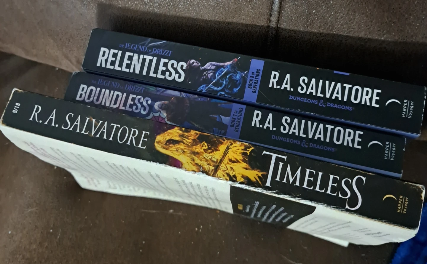 Three R.A. Salvatore Drizzt novels: Timeless, Boundless, and Relentless. These books are part of the 'Books of Generations' series. They're written by a New York Times bestselling author. Perfect for fantasy readers!