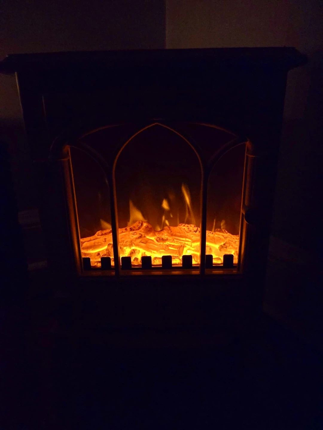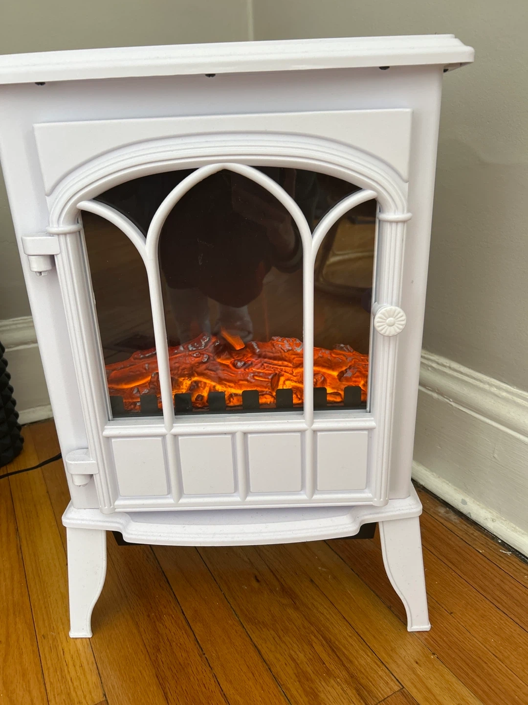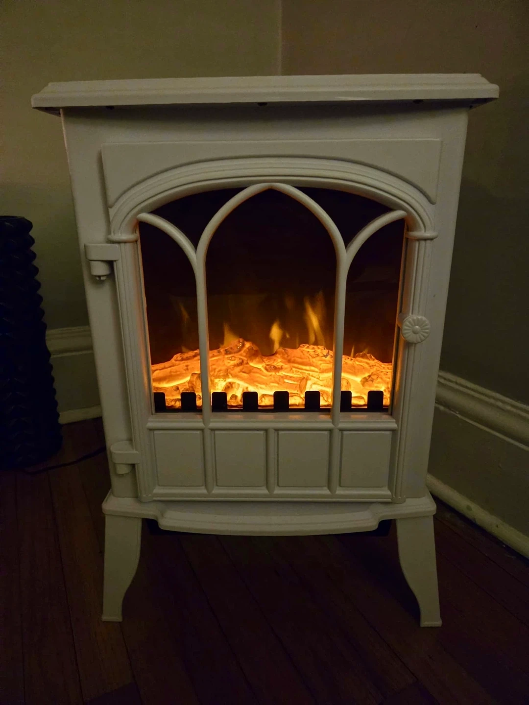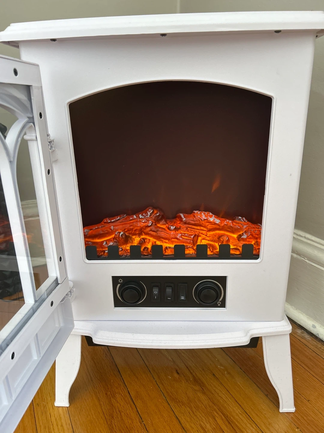 This white electric fireplace stove heater provides a cozy ambiance with its realistic flame effect. It features adjustable controls for flame intensity and temperature. It's great for adding a decorative touch and supplemental heat to any room!