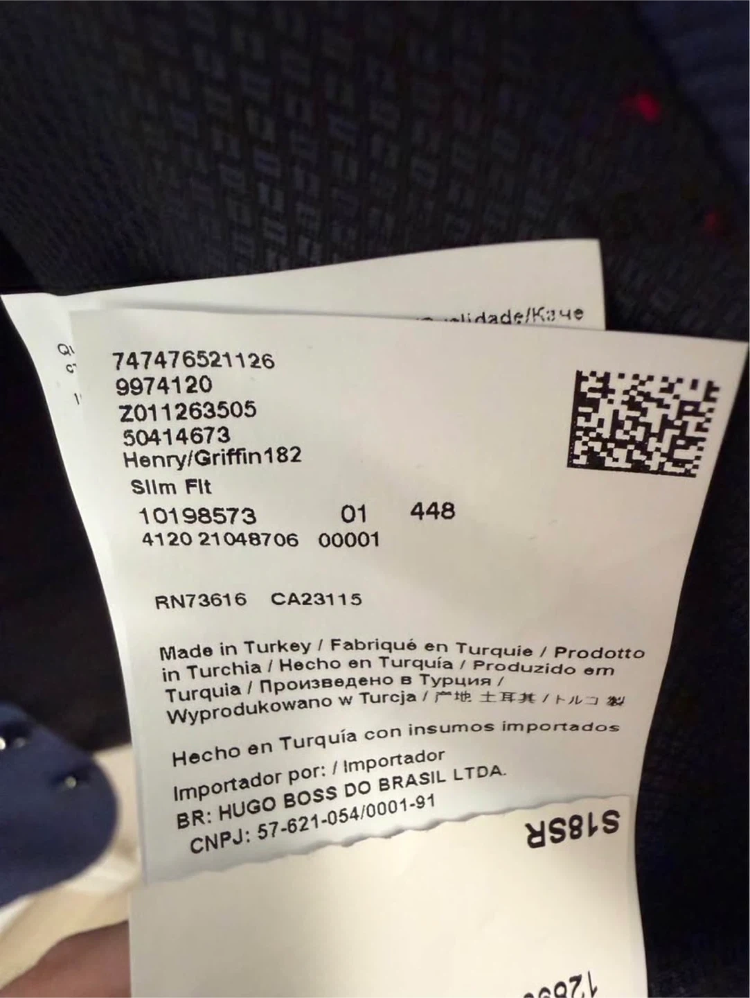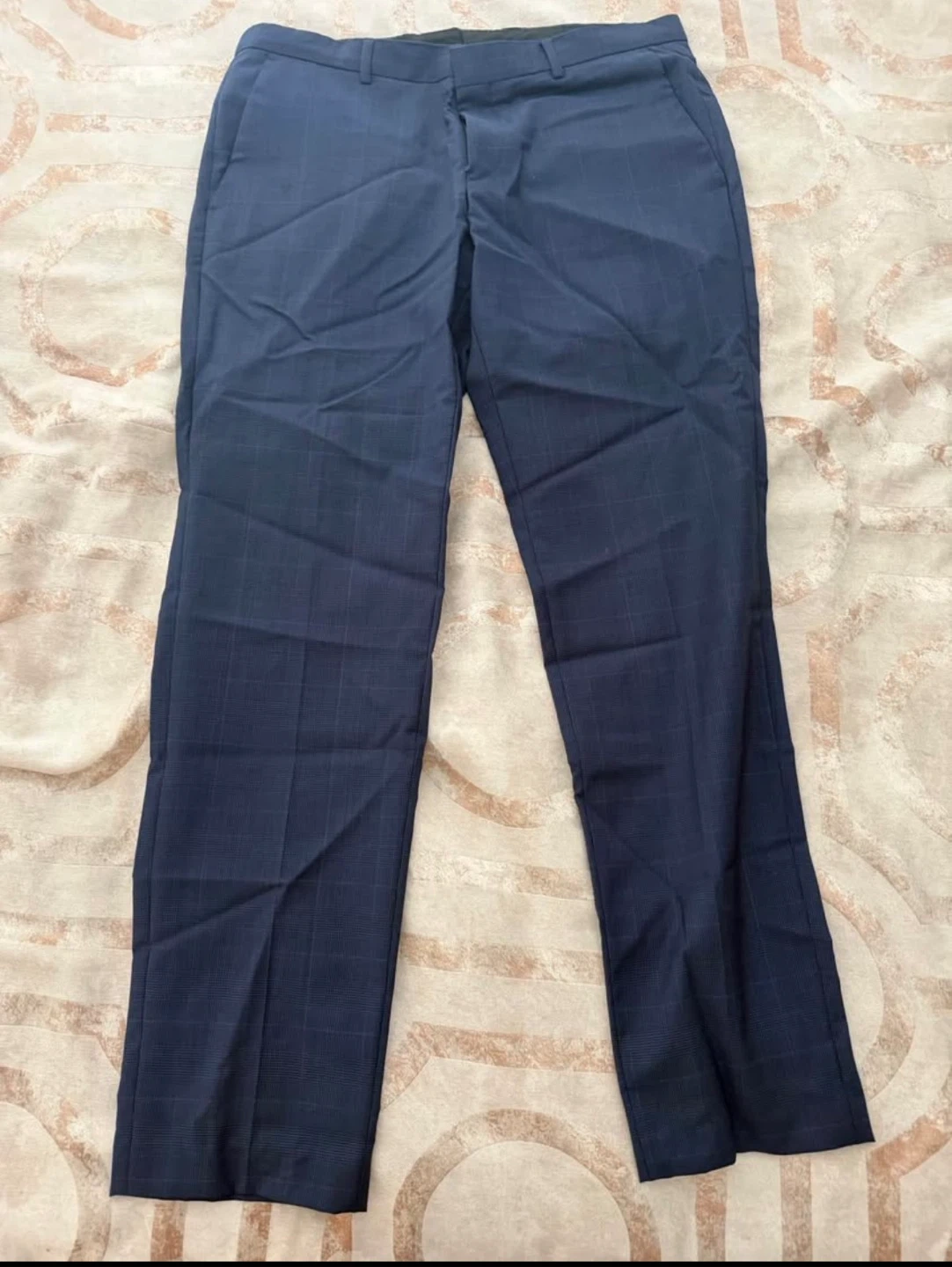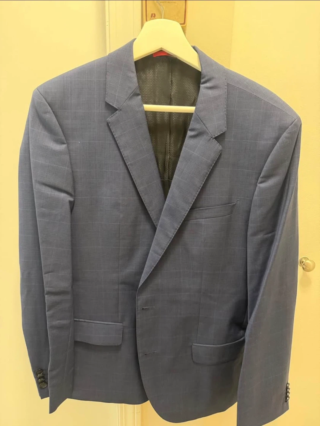 Hugo Boss suit in a navy blue checkered pattern. Features a slim fit design. Made in Turkey. Includes original tags.