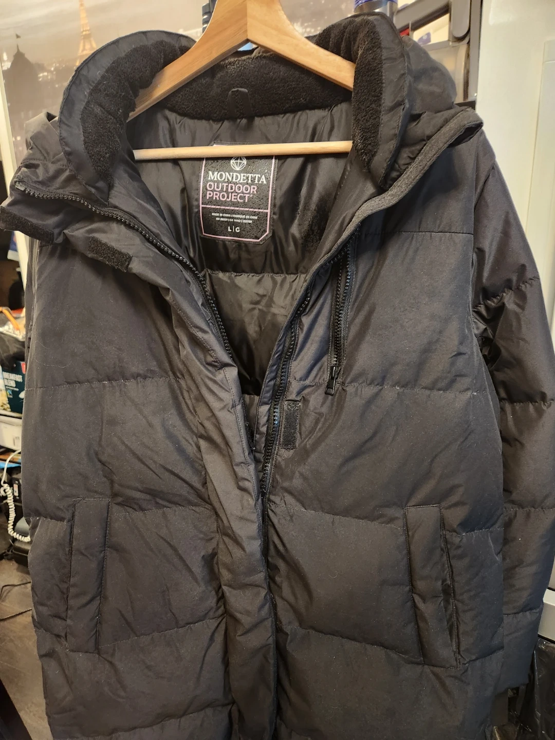 This black Mondetta Outdoor Project puffer jacket is a size large. It's a warm and durable coat. It's great for staying cozy during colder weather!