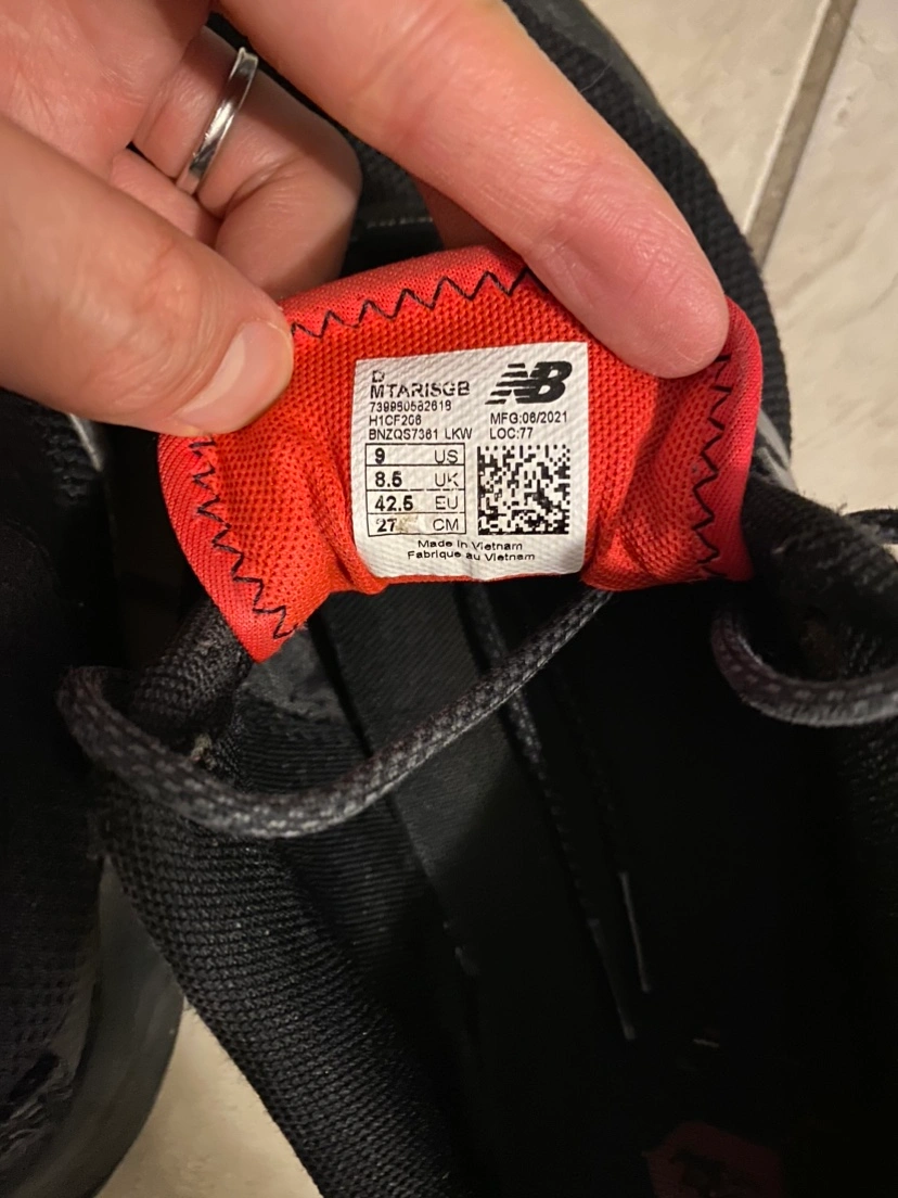 Men's size 9 running shoes in black with grey and red accents. Features Gore-Tex waterproof technology.