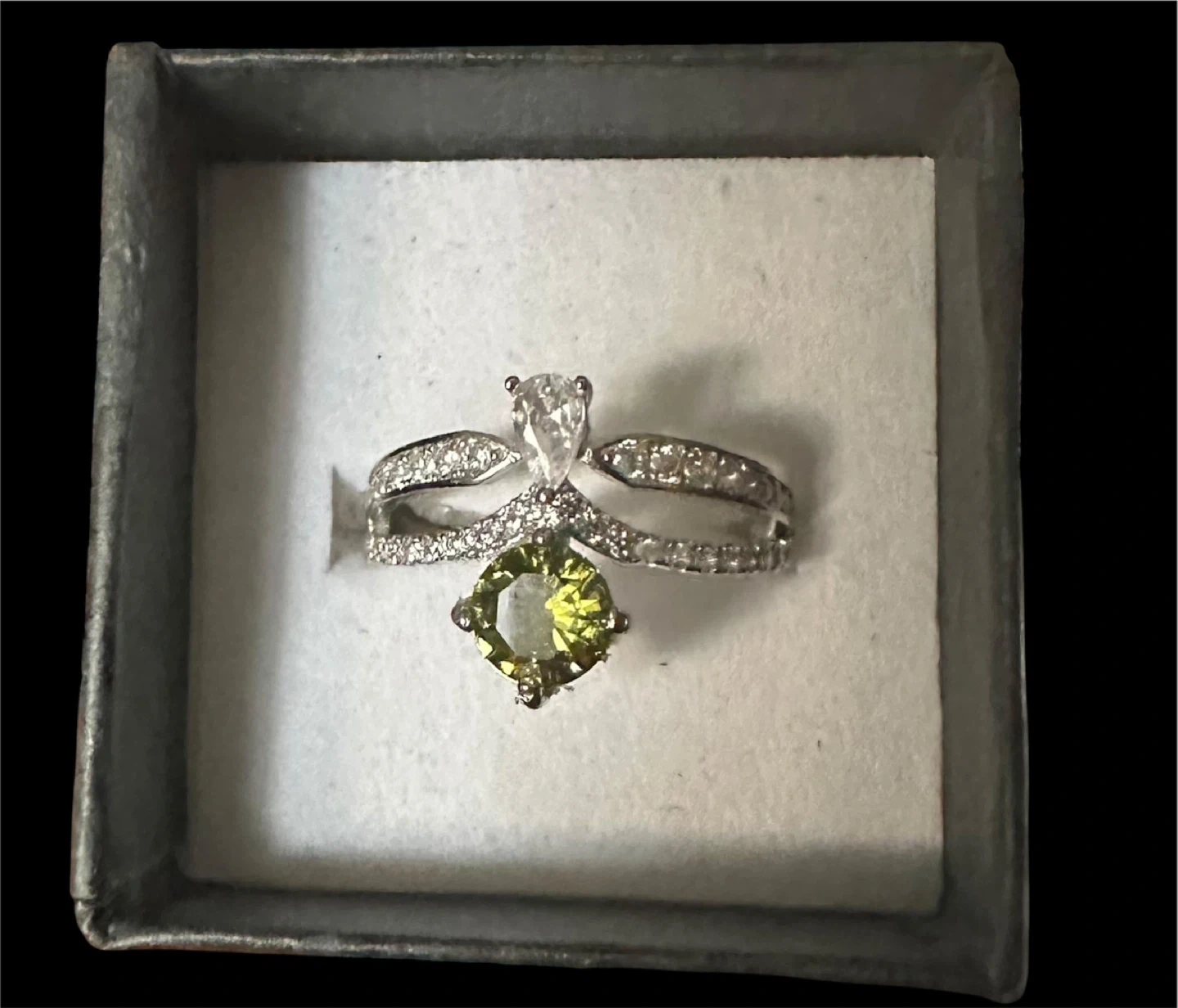 Selling a beautiful sterling silver adjustable ring. It features a vibrant green CZ 6.5mm stone and a smaller white, teardrop-shaped CZ stone. The band is also adorned with small sparkling stones. It's marked "S925" indicating sterling silver. New Comes in a box!