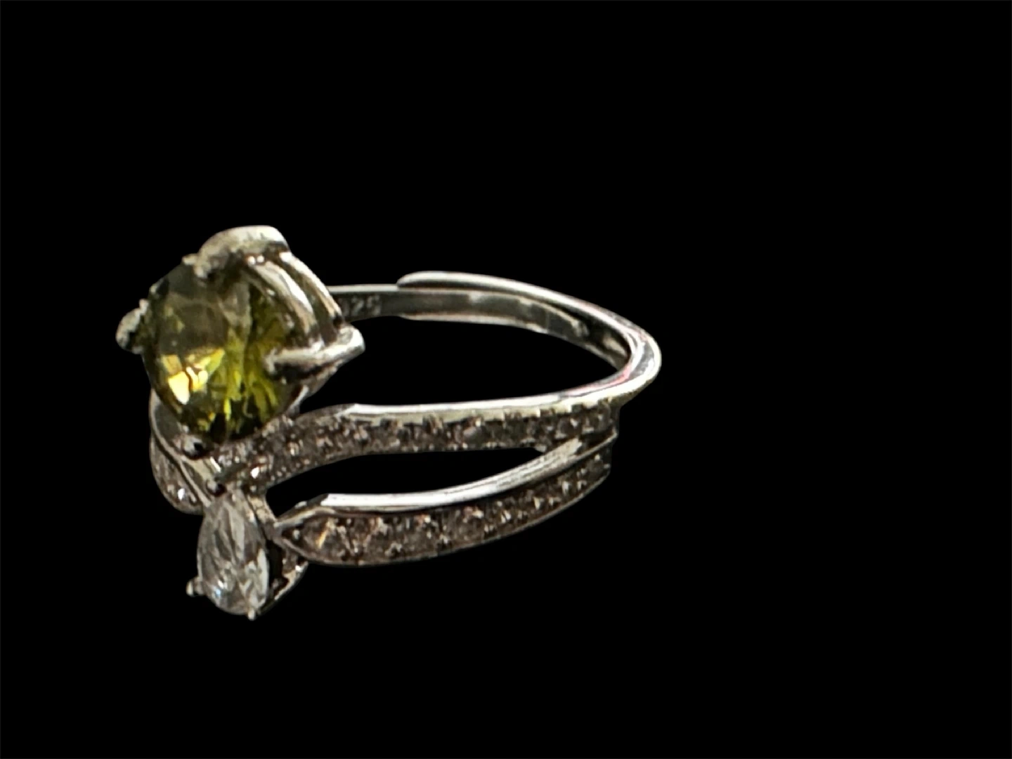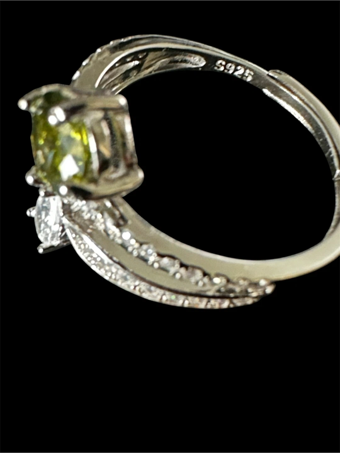Selling a beautiful sterling silver adjustable ring. It features a vibrant green CZ 6.5mm stone and a smaller white, teardrop-shaped CZ stone. The band is also adorned with small sparkling stones. It's marked "S925" indicating sterling silver. New Comes in a box!