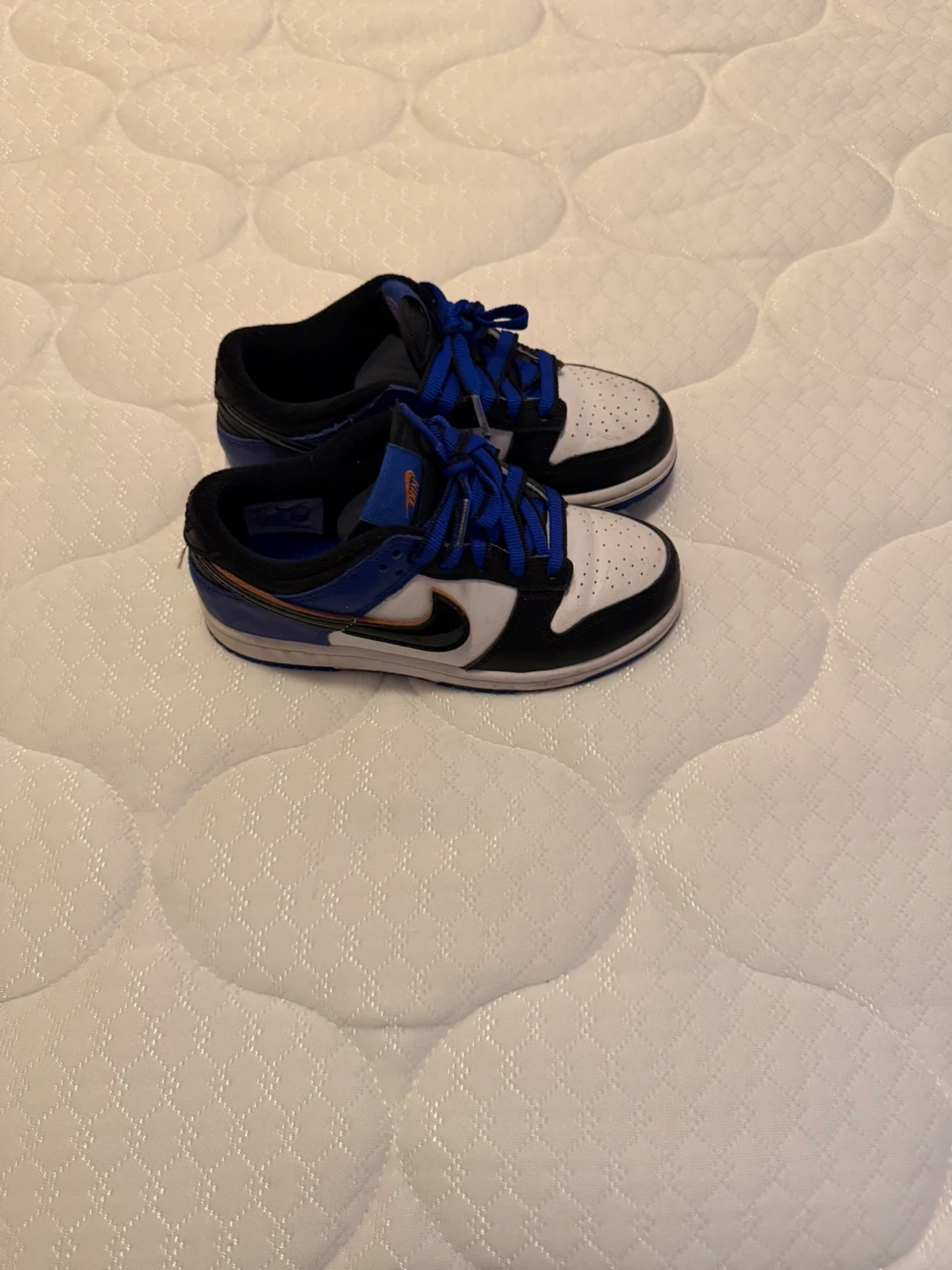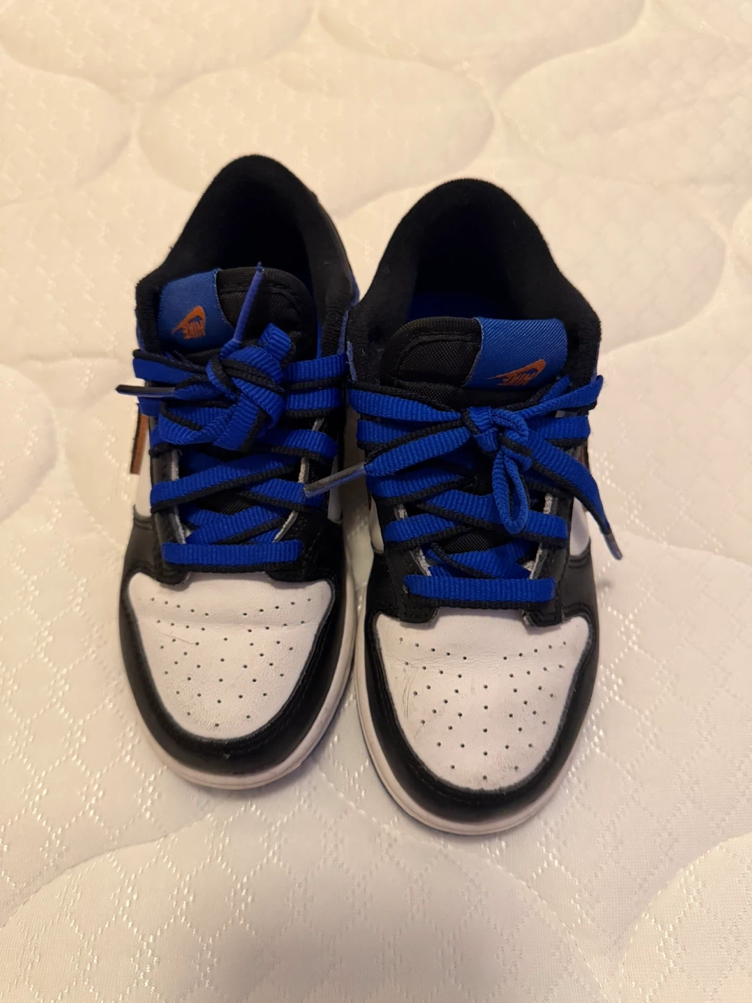 Youth Nike Dunk Low TD "Reverse Royal" sneakers. Features a white, black, and royal blue colorway with a leather upper and rubber sole. Perfect for little ones on the go!
