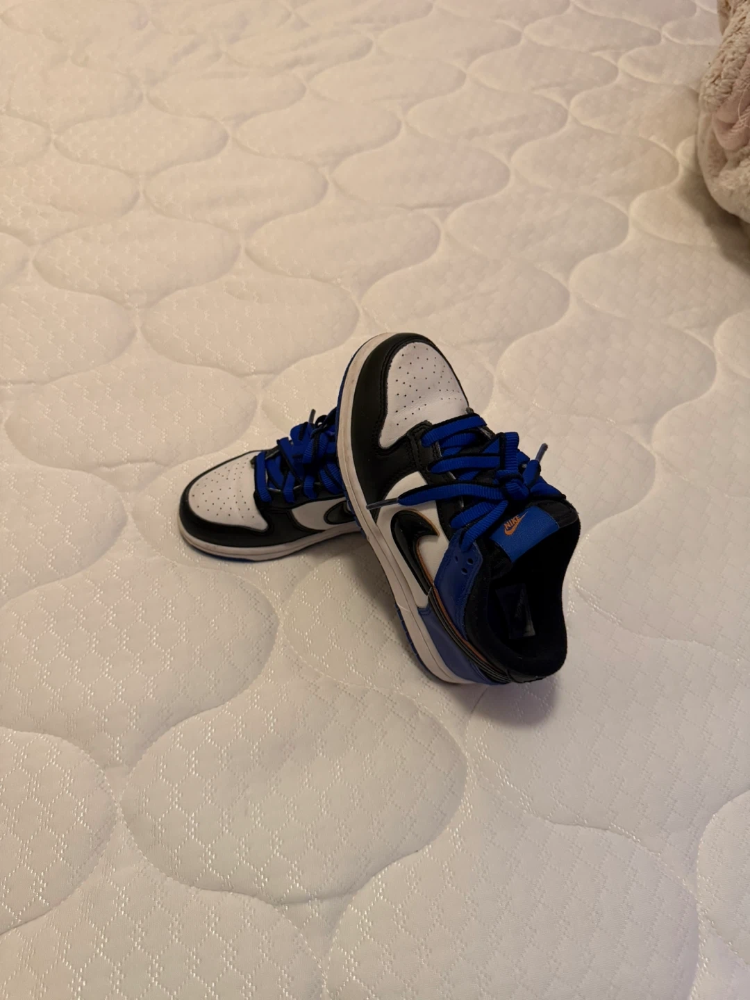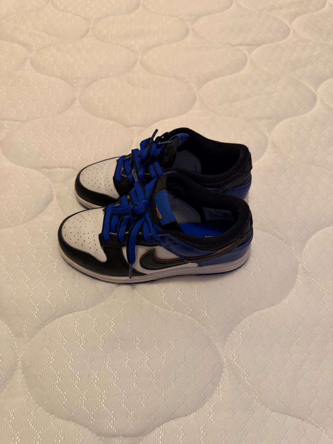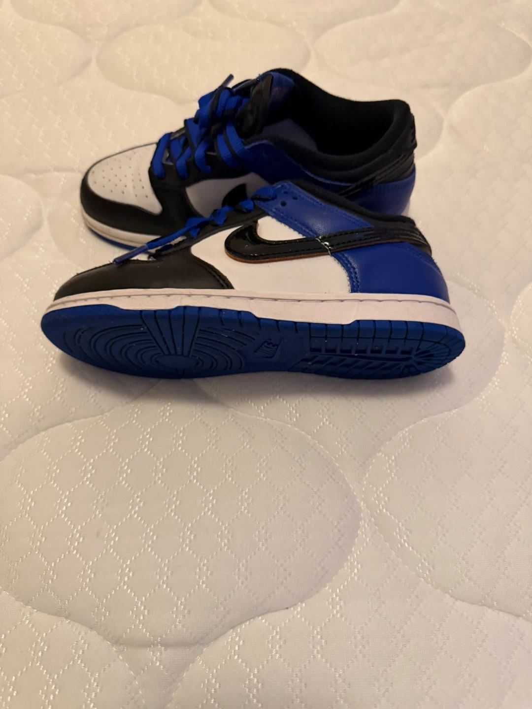 Youth Nike Dunk Low TD "Reverse Royal" sneakers. Features a white, black, and royal blue colorway with a leather upper and rubber sole. Perfect for little ones on the go!