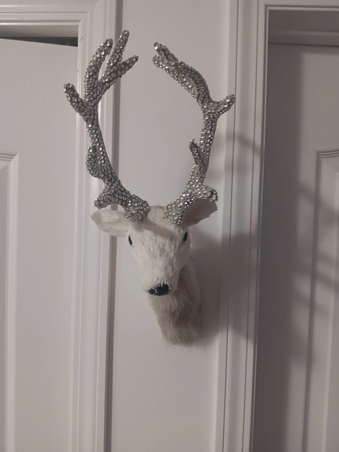 This decorative deer head features a fuzzy white body and sparkly antlers. It's a charming piece for adding a festive or whimsical touch to your space. It's about 18 inches tall.